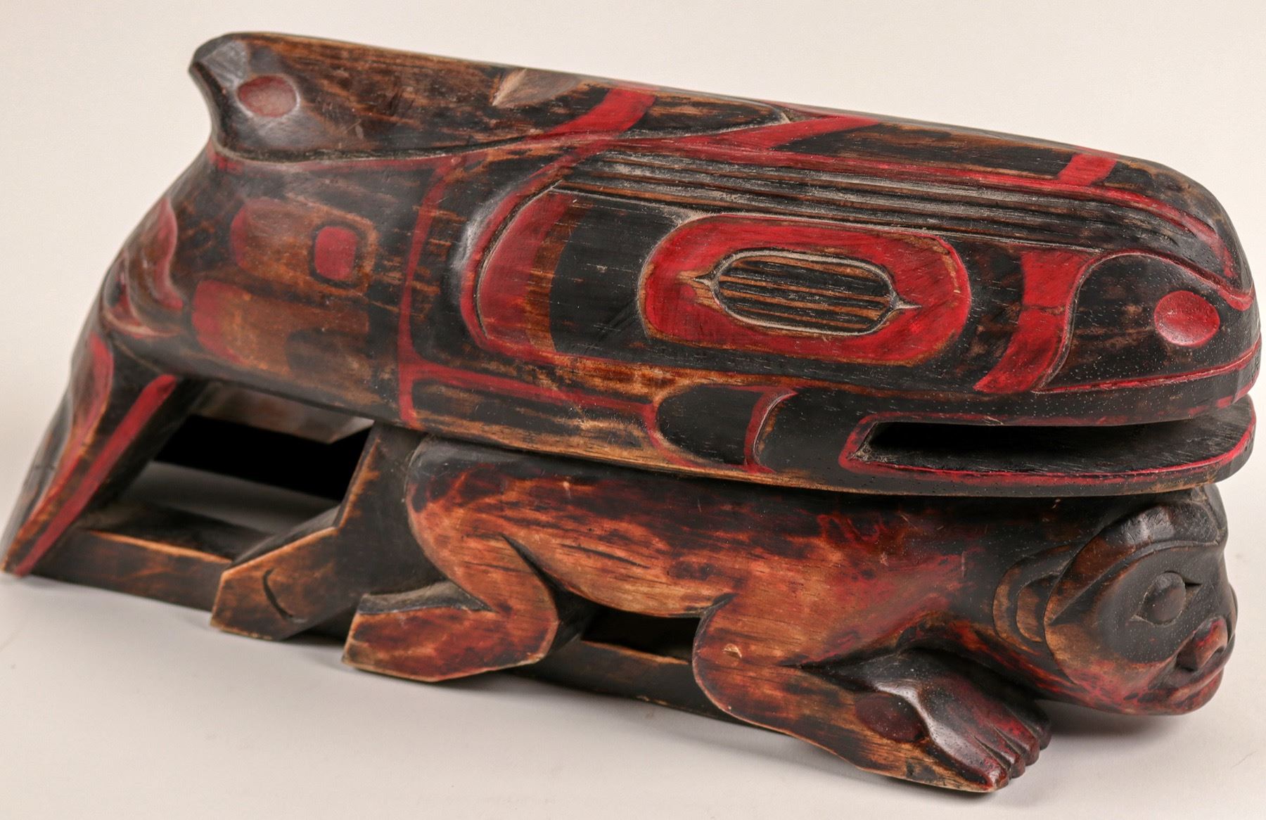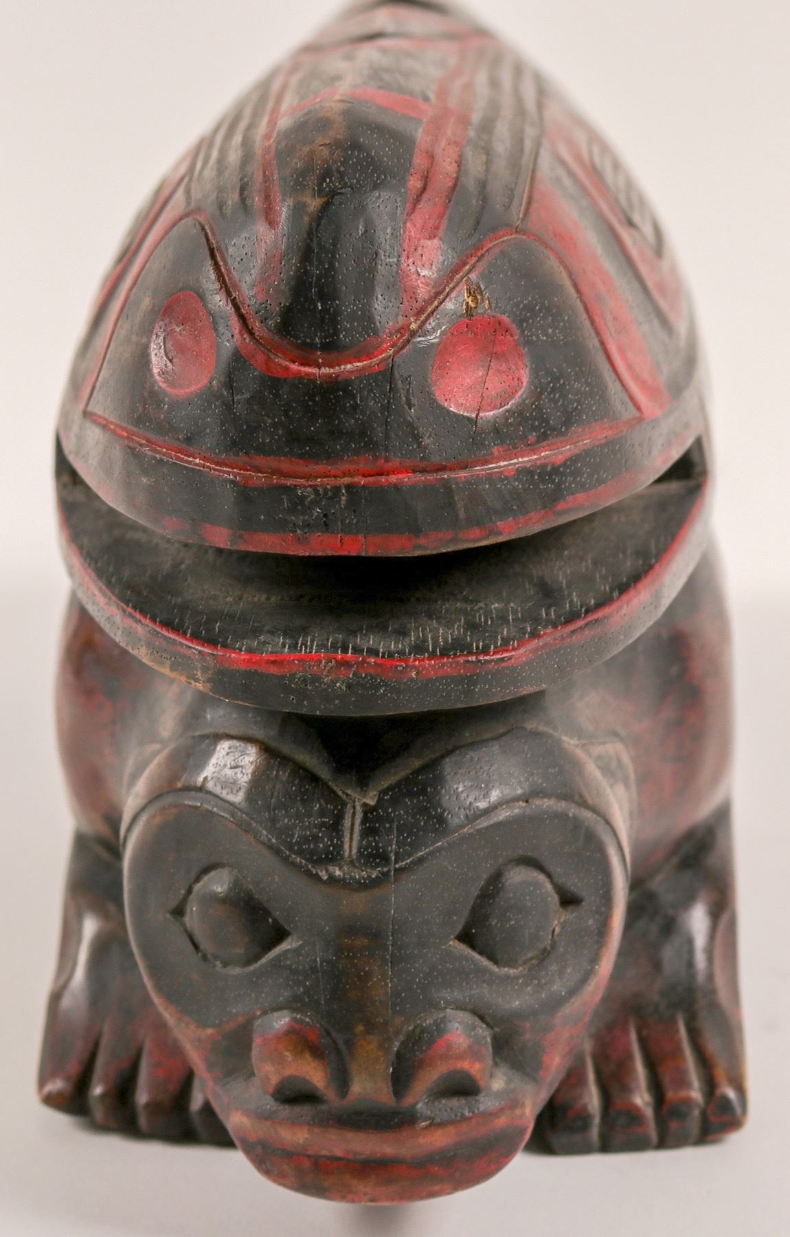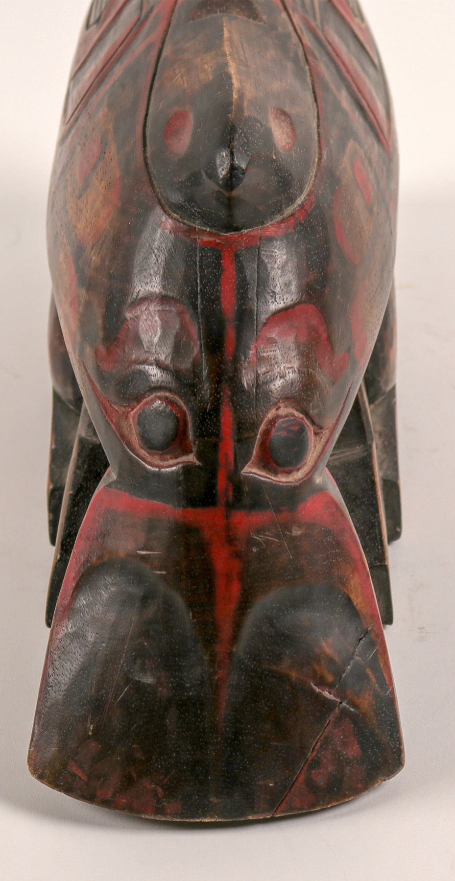 Beautiful Haida whale on top of human effigy, 15" long, 7" tall, 5" wide, painted wood. Red and black colors, worn. Hand carved and finished. Probably too old for a signature.Possibly circa 1900-1910. May represent the killer whale culture, where in ancient times, people put on whale skins to visit with the underwater people.