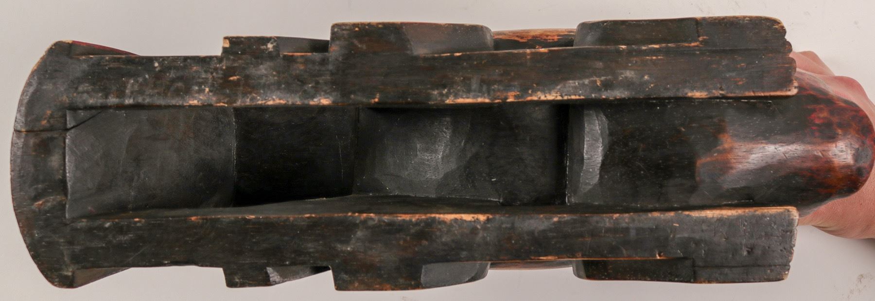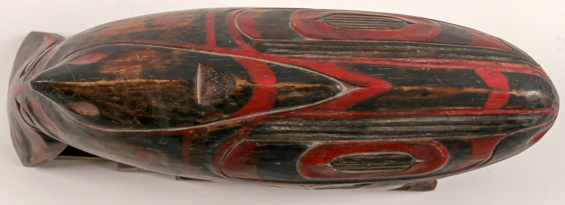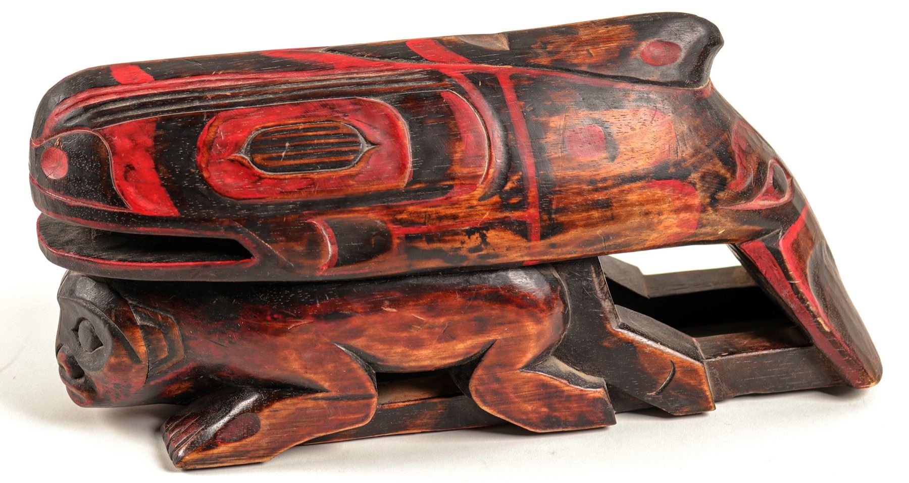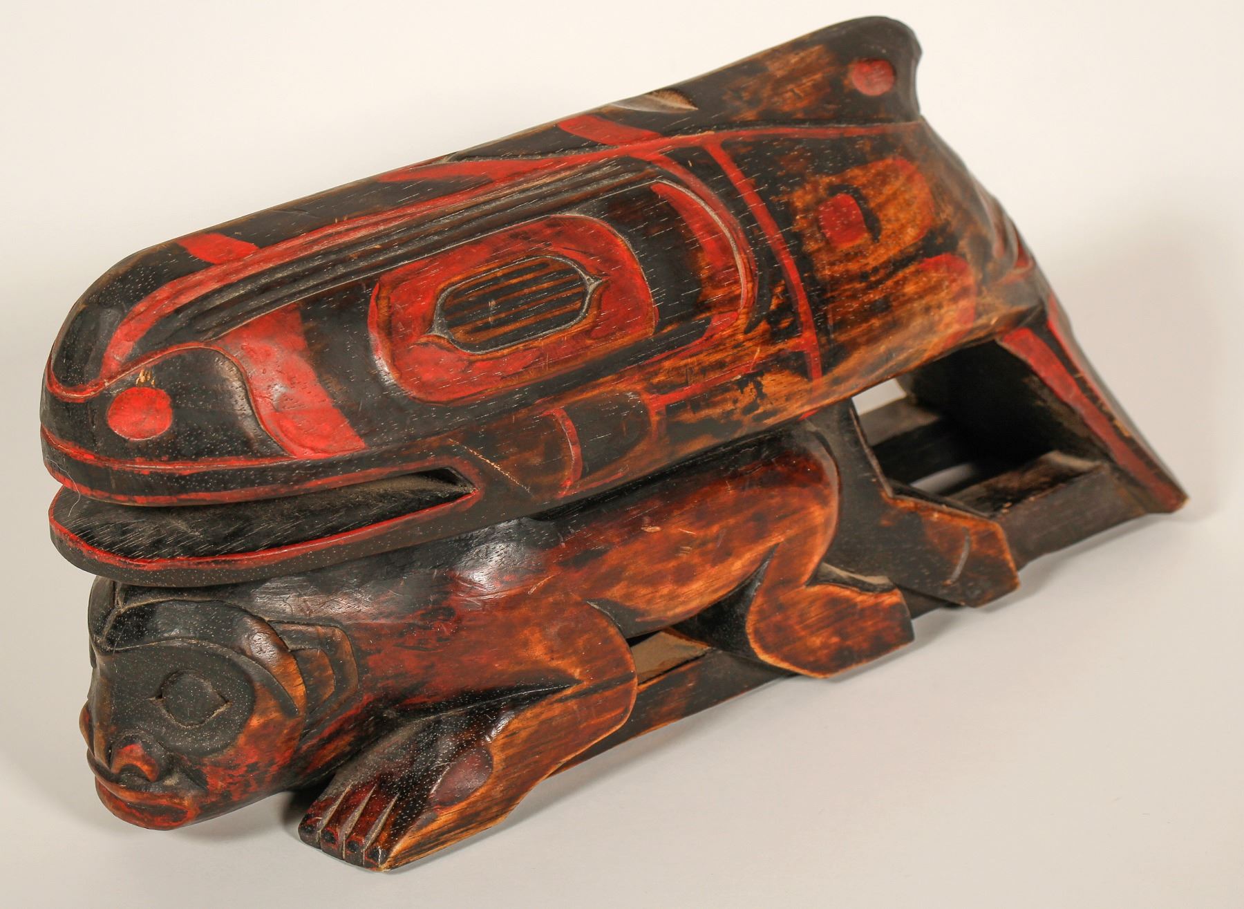 Beautiful Haida whale on top of human effigy, 15" long, 7" tall, 5" wide, painted wood. Red and black colors, worn. Hand carved and finished. Probably too old for a signature.Possibly circa 1900-1910. May represent the killer whale culture, where in ancient times, people put on whale skins to visit with the underwater people.