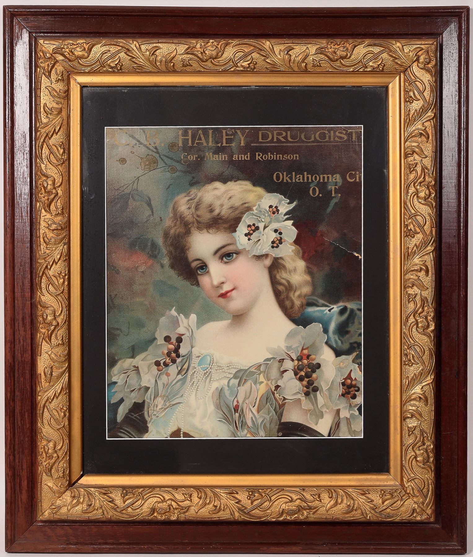 Original Victorian to c. 1900 chrome litho wall advertising, "C. B. Hailey Druggist, Cor. Main and Robinson, Oklahoma City, OT". c. 1900 frame, 24x28". Generally very fine condition, stain lower and upper left, small tear. Presents beautifully.