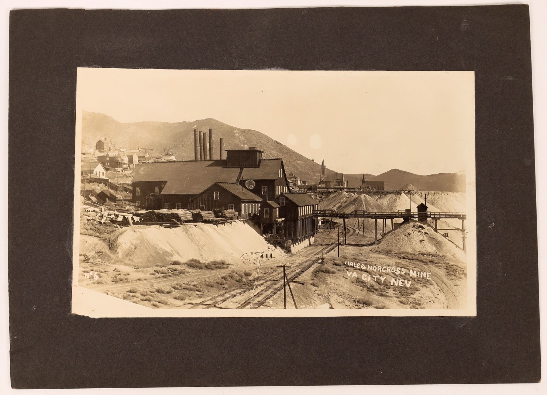 "No. 6 HALE & NORCROSS MINE VA CITY NEV" written in white text on the photo. No photographer listed. 4.75 x 7.75" photo on 7.5 x 10.5" board. Stains, tear in bottom left corner. Good contrast and sharp focus. The Hale & Norcross Mine was staked in 1859 and located between the Savage and Chollar Mines. In the early 1860s, a 3 compartment shaft was sunk to explore the property at greater depths. In 1868, William Sharon controversially elected a board of directors, but the mine wasn't successful that year. James G. Fair saw an opportunity, and convinced John Mackay and James Flood that the property was a worthy one to pursue. They secretly bought up shares and wrestled control of the mine away from Sharon and the Bank of California in 1869. This was the first large move by the Bonanza Firm; they would go on to make millions with the Bid Bonanza discovery in 1873. Flood became president and Fair was elected superintendent, and the mine prospered under their management. In the 1870s, the Hale & Norcross joined forces with the Chollar-Potosi and Savage mines to sink the Combination Shaft which reached over 3,000 ft. in depth.