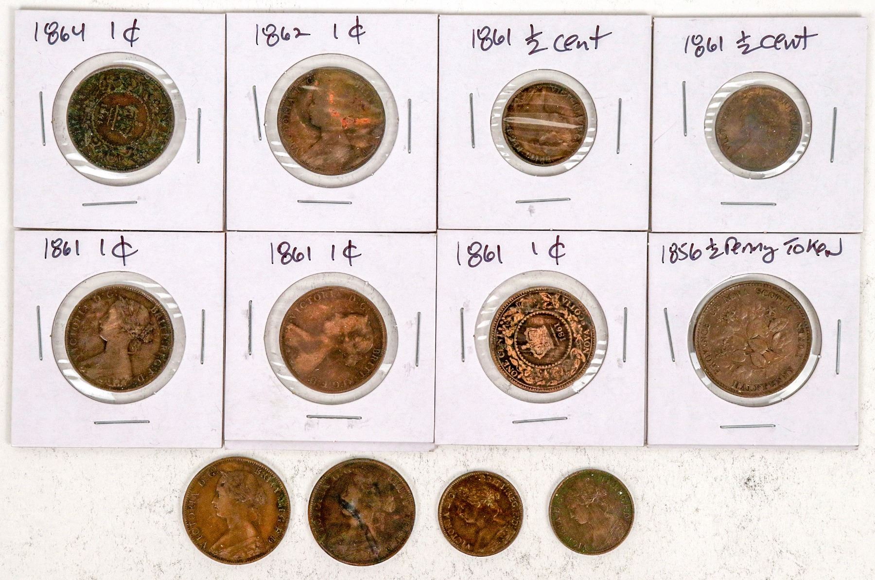 Twelve Nova Scotia coppers. Five half cents: 1856; 1861(3); 1864. Seven pennies: 1861 (4); 1862; 1864 (2). Several are EF, several VG, a couple Fine.