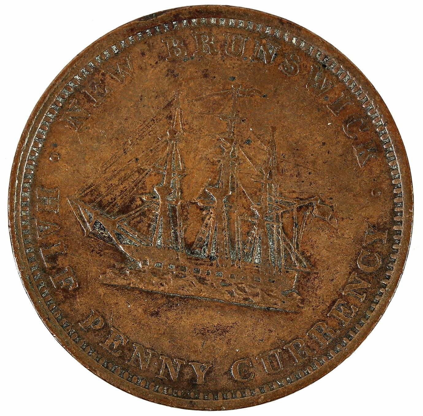 Obv.: Left profile of Victoria / VICTORIA DEI GRATIA REGINA / 1854. Rev.: H.M.S New Brunswick sailing left / * NEW BRUNSWICK * / HALF PENNY CURRENCY. Engraver: Leonard Charles Wyon. Copper; 7.9 grams; 28.3 mm. Vg-F condition.