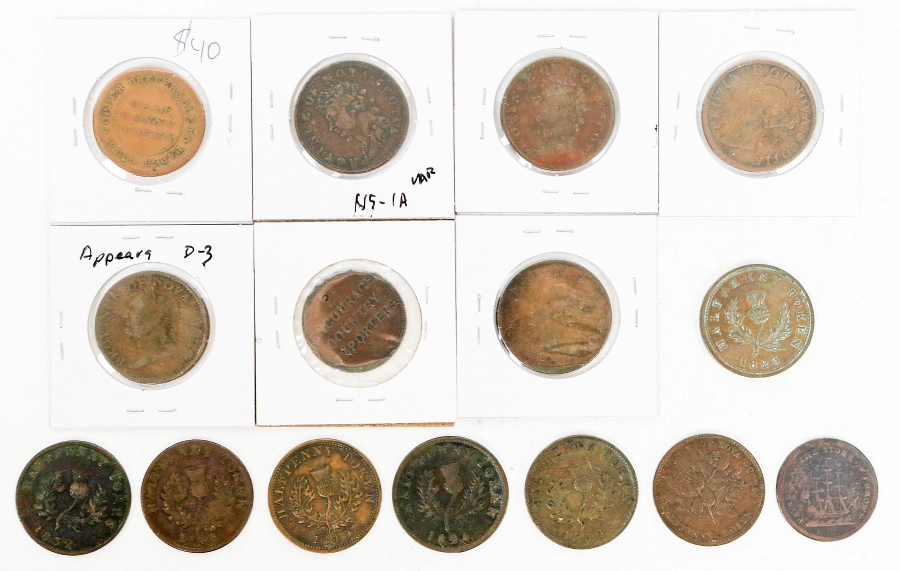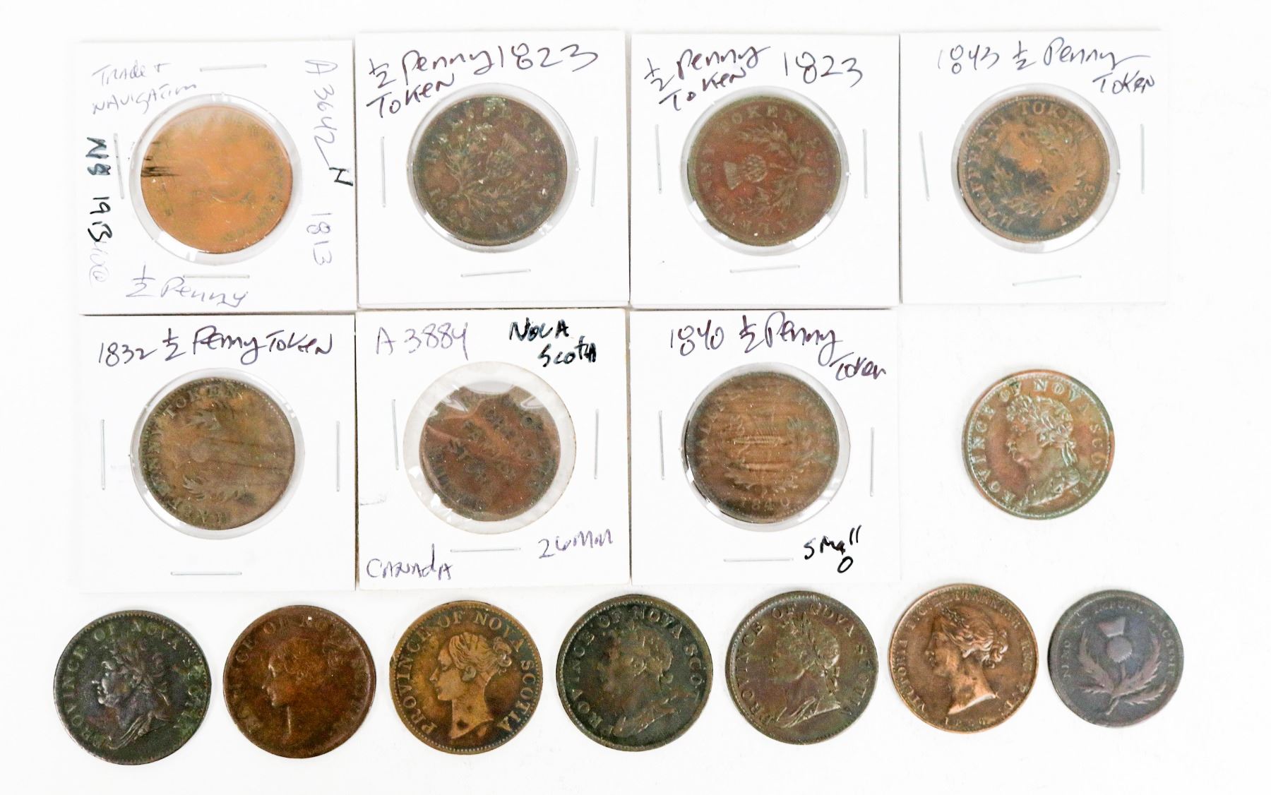 Fifteen Nova Scotia half pennies from 1823-1856. NS-1 (3); 1831 NS-a C2; 1832 NS-1D3; 1840 NS-1F; 1843 NS-1F; 1856 NS-5; J. Brown NS-1G; 1813 Trade & Navigation; Purvis-Wallace.