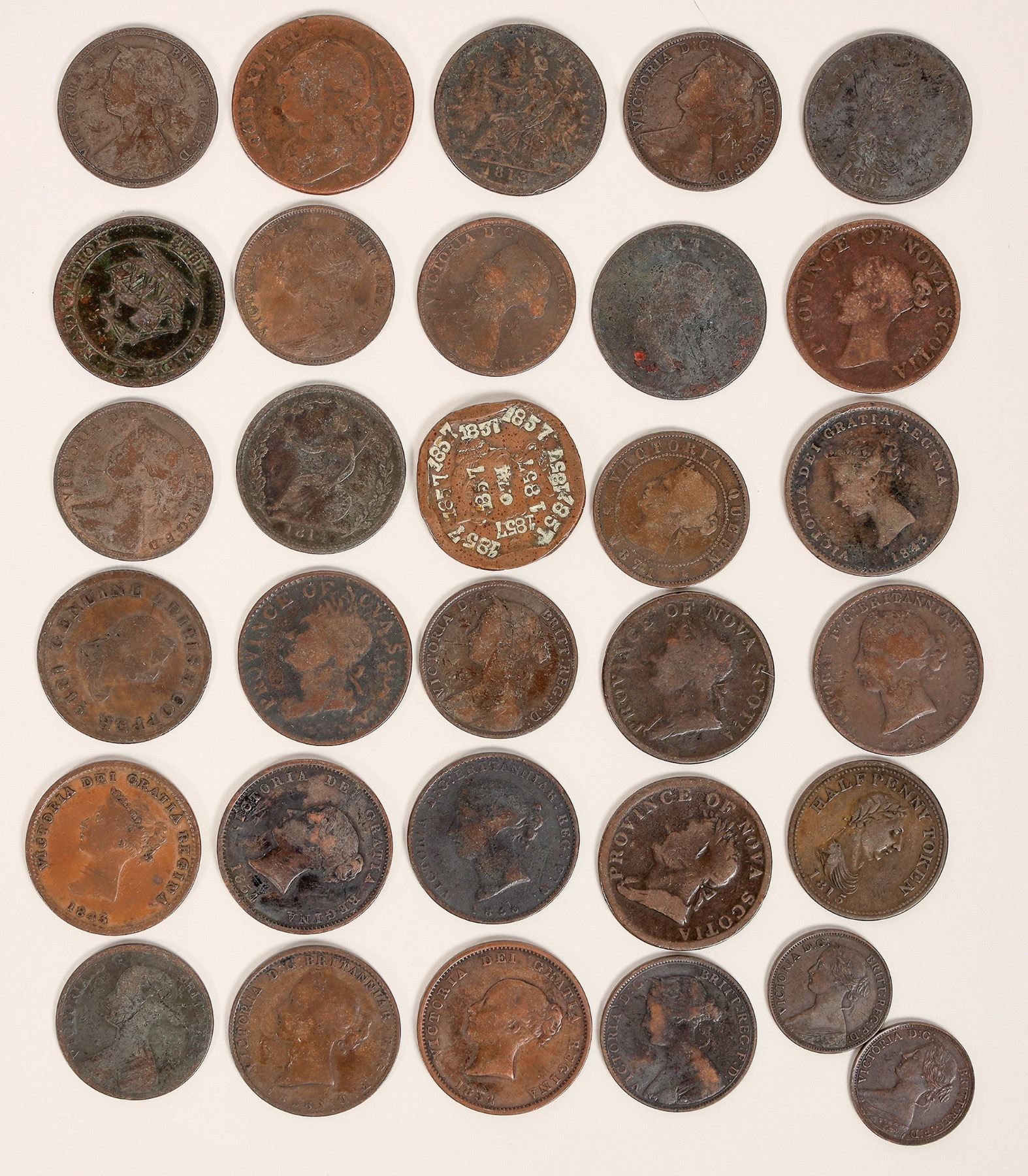 Lot of 31 half pennies from Canadian provinces: New Brunswick, Nova Scotia, Prince Edward Island. Dated 1812 through 1870s. [