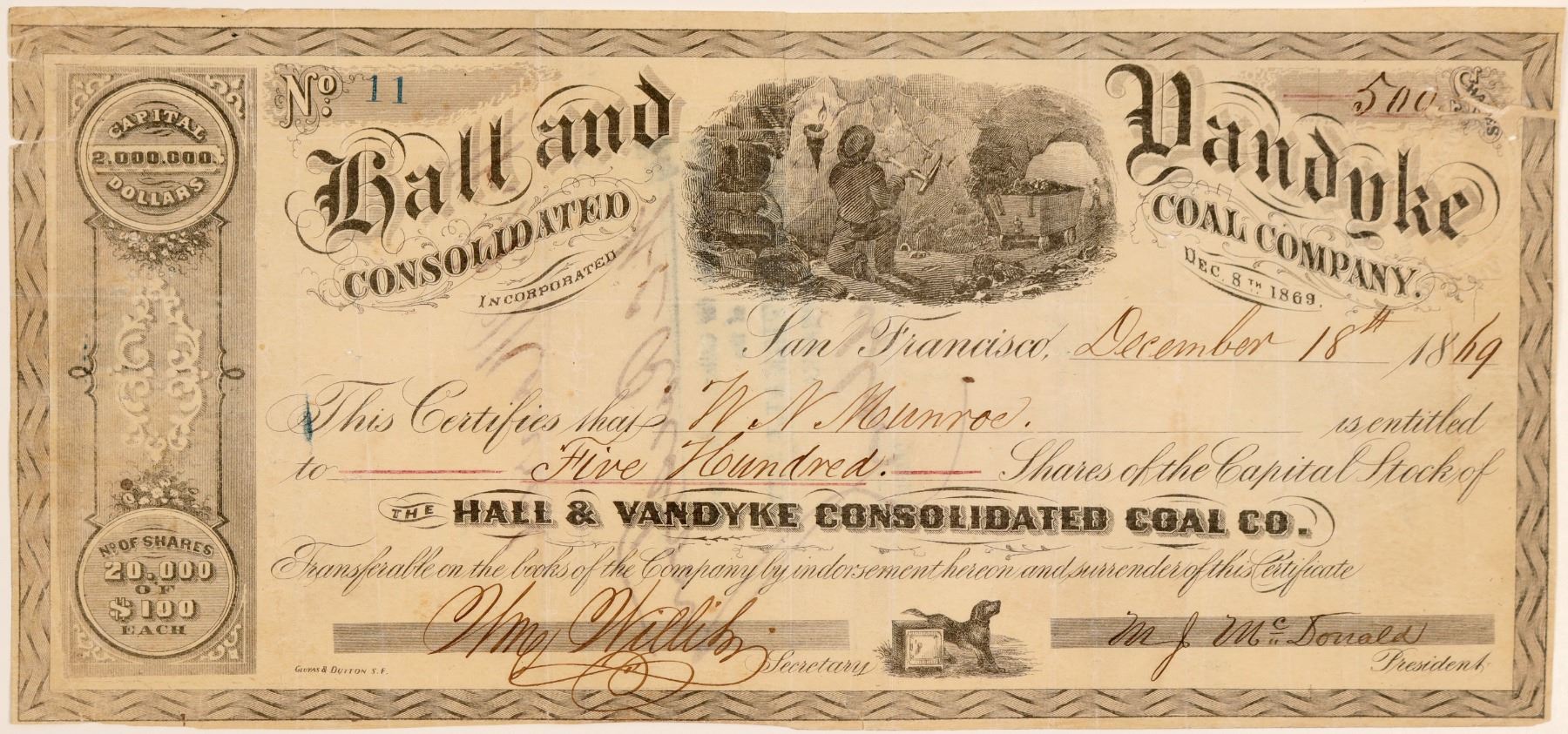Inc. Dec. 8th, 1869. Low number 11, issued for 500 shares to WN Monroe on Dec. 18th, 1869 in San Francisco. Signed by president MJ McDonald and secretary William Willits. Not cancelled. Black border and print. Two vignettes: underground mining scene (top center) and dog next to safe (bottom center). Printed by Gluyas & Dutton, SF. Pinholes, folds, creases, toning. 4 x 9" Located at Hallville and Rock Springs, Carter County, Territory of Wyoming, according to Daily Alta California articles from 1870. Not in Filer or Holabird indexes.