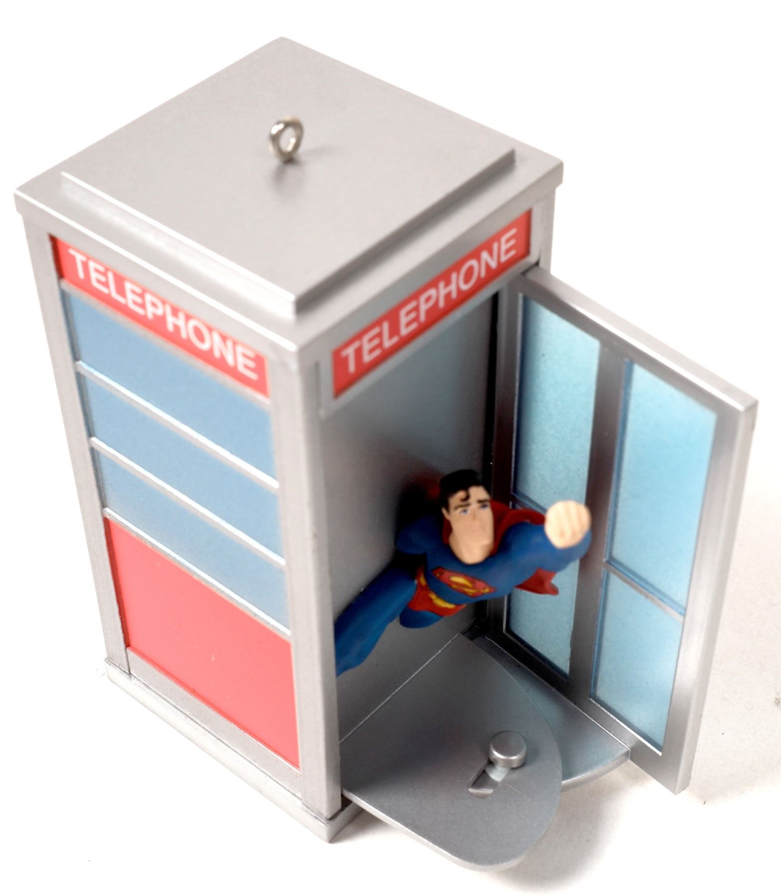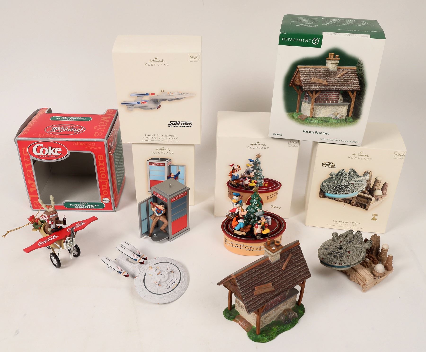 4 Hallmark Keepsake movie themed Christmas ornaments in original boxes. Superman, Star Wars, Star Trek, Mickey's Jingle Bell Express. Department 56, Masonry Bake Oven, new in box. New in box Rudolph in a plane.