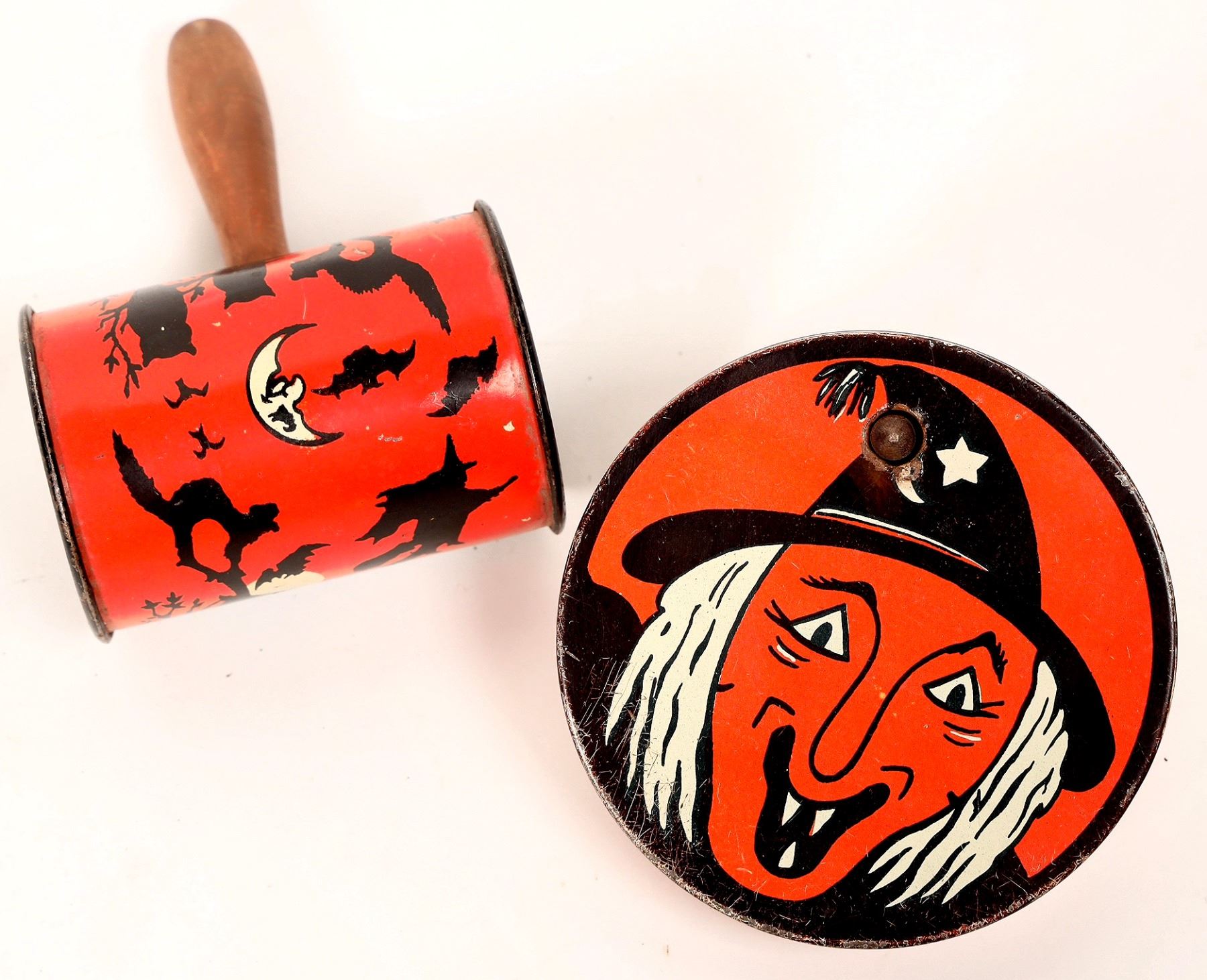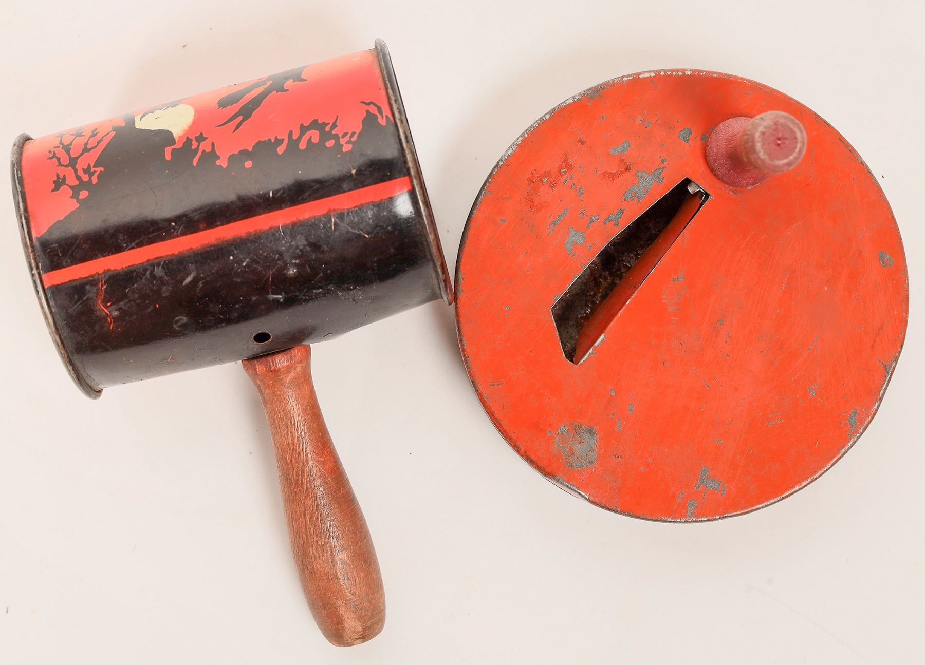 Orange colored cannister with shaker material inside and wood handle, 3x6". Orange with ratchet noisemaker, 4".[