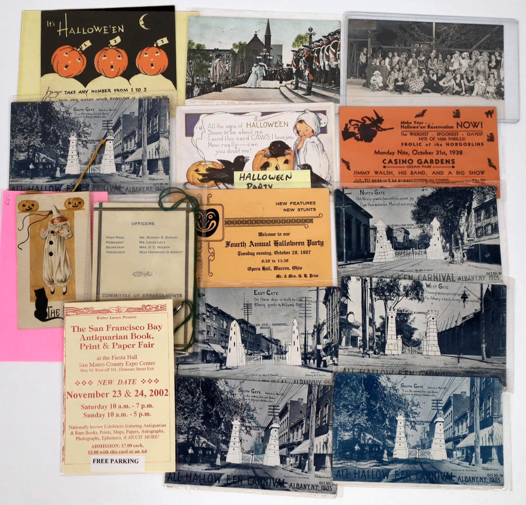BOO! You're invited to a variety of Halloween events across the country with this set of postcards and other ephemera from the Ken Prag Collection, even pick a number and read your fortune. See photos for a representative sample of the contents.