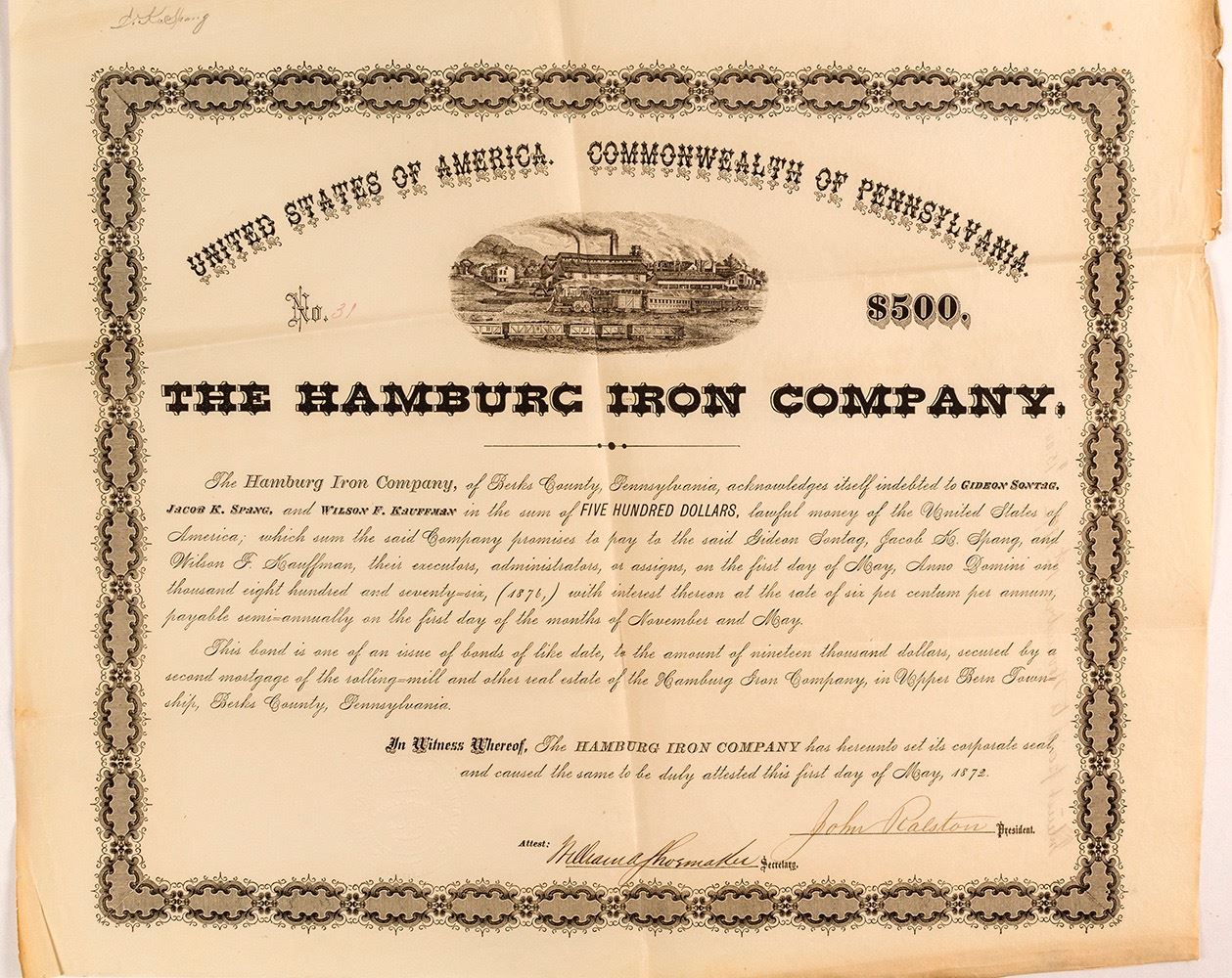 1872. Interesting exquisite document. It is for $500 and indebts the Hamburg Iron Company to Gideon Sontag, Jacob k Spang and Wilson F Kaufman. Payable in four years. Back says interest paid to November 1, 1872. No more notations! Signed by president John Ralston. Vignette of what I assume is the company. Hamburg Iron Company eventually was merged with other iron companies to form the Hamburg Rolling Mills. Large 13 x 16". Dog ear bottom left and small tear top right. Otherwise - great condition. Date: Location: Berks County, Pennsylvania HWAC # 54565