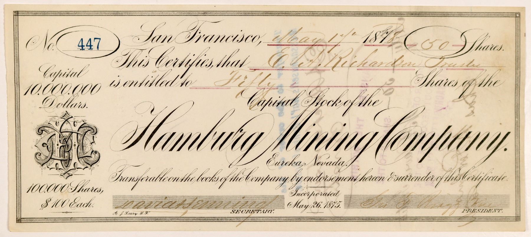Inc. May 26, 1875. No. 447, issued for 50 shares to E.A. Richardson on May 17th, 1878 in San Francisco. Signed by vice president Geo. F Bragg and secretary DA Jennings. Not cancelled. Black border and print, fancy logo. Printed by AJ Leary, SF. Pinholes, folds. 4 x 9" Property consisted of 50 acres covering parallel veins in the same ore channel as the Eureka Cons., Richmond, Phoenix, and others. Surface developments have yielded $200,000: 16-60 percent lead, $40-80 per ton in gold and silver. They have 800 tons of ore in their dump. "Caves filled with rich ore have been discovered." [Pacific Coast Annual Mining Review, 1878, pg. 201-202] Ken Prag Collection