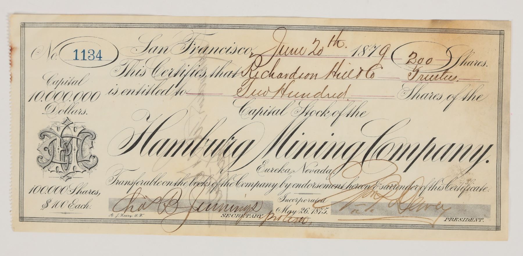 "Eureka, Nevada" printed under title. No. 1134, issued for 200 shares to Richardson Hill & Co. in 1879. Signed by president Dewey and secretary Jennings. Not cancelled. Black border and print, AJ Leary, SF. Pinhole, folds, toning/soiling. This company operated a placer operation in Fish Gulch, upper New York Canyon near Eureka, Eureka County.