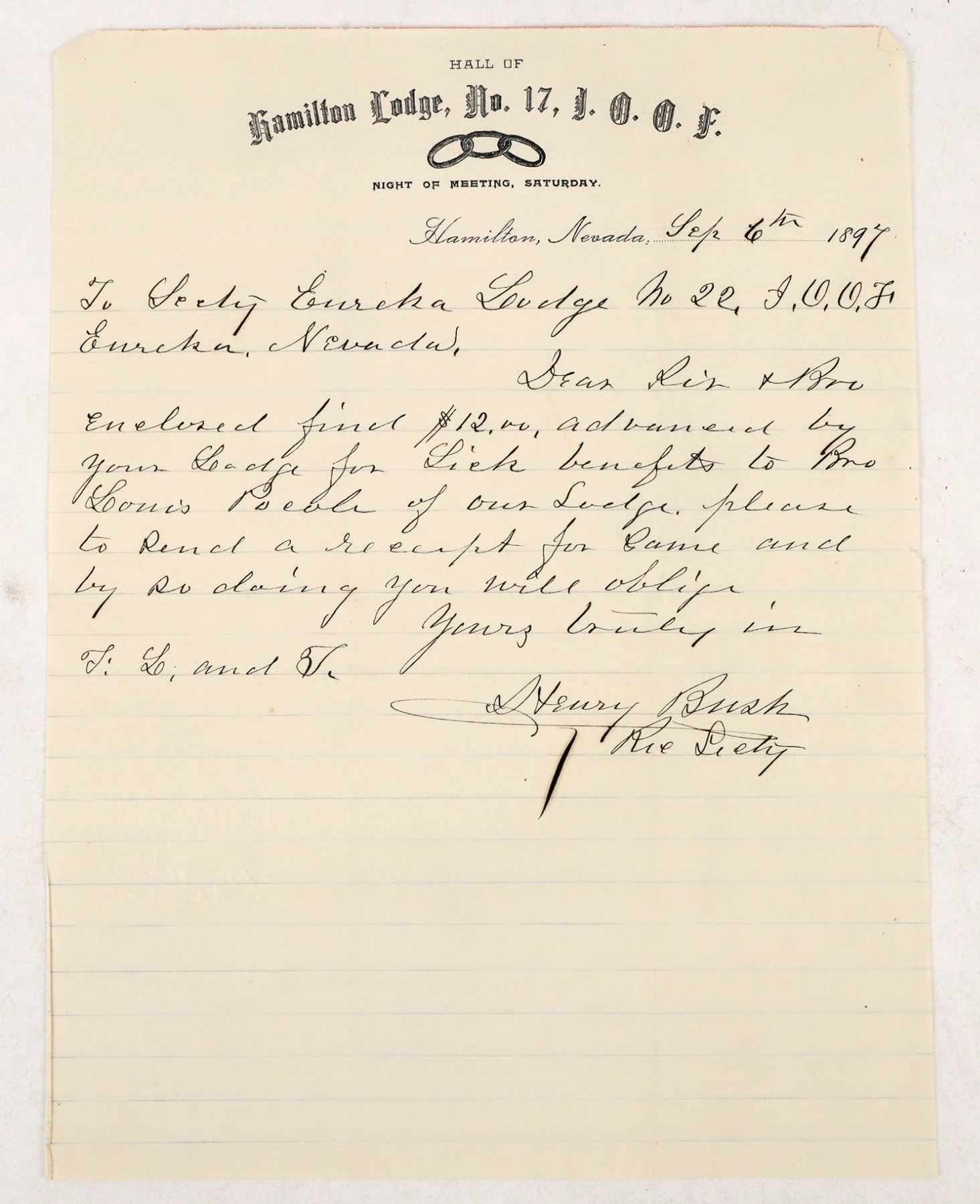 Rare letterhead for Hamilton IOOF Lodge, 1897, signed by Henry Bush. Henry Busch was born in Prussia in 1840 and arrived in Winnemucca sometime between 1875-77. He opened a saloon in 1878 and may have had the first soda works in Winnemucca. We have sold bottles for him. See Fred Holabird's Bottle Book for more info. From Fred Holabird's personal collection.