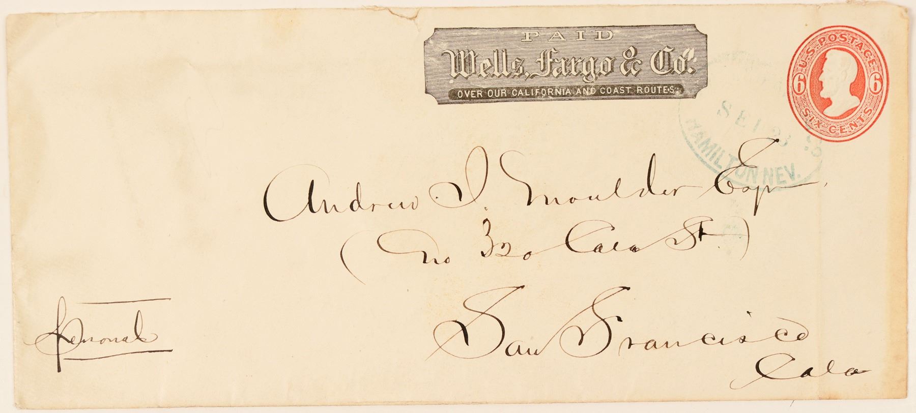 c1870. Nice red wax seal for the Raymond & Ely Mine on the reverse. Legal sized Wells Fargo entire. Includes a history of the Raymond and Ely Mine. Addressed to Andrew H Moulder of San Franicsco (extensive biography, Board of Regents, University of California, stock exhange, San Francisco Superintendent of Public Schools, reporter, arrived in California in 1850)