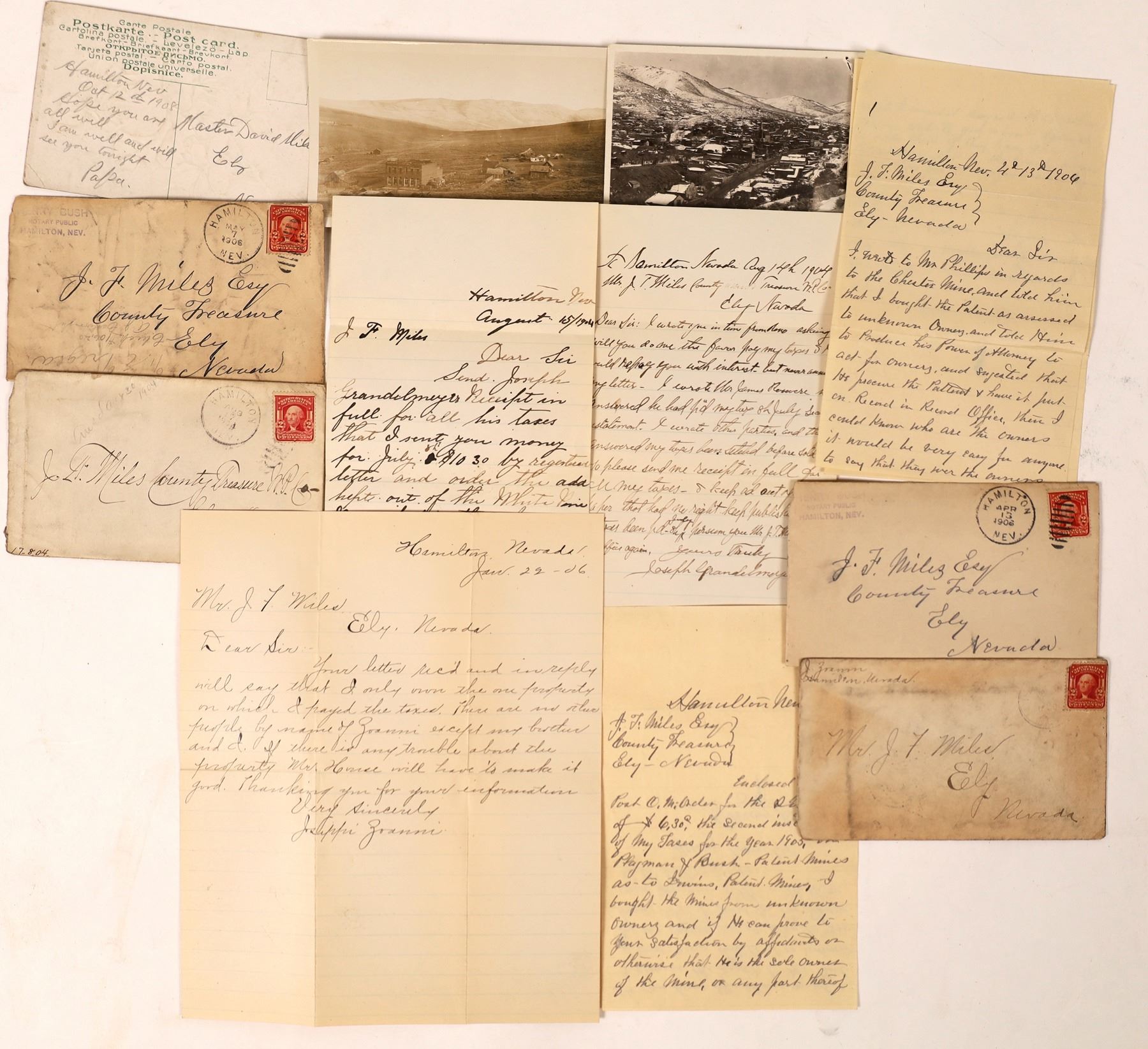 Lot of 6. Four 1904/06 covers from Hamilton to B. F. Miles, county tax collector. All with content. “I only own one property!” All with names of senders. One photograph of a Hamilton as a ghost town taken by John W. Walker, Electric Studio, Ely. Extremely interesting! 1926 postcard of Austin in the snow. (W. D. Miles Collection) Items in this collection range from fair to very nice.