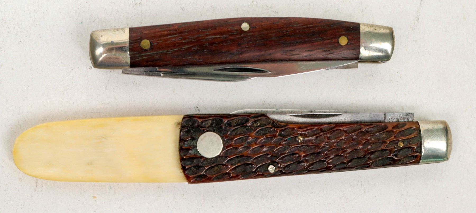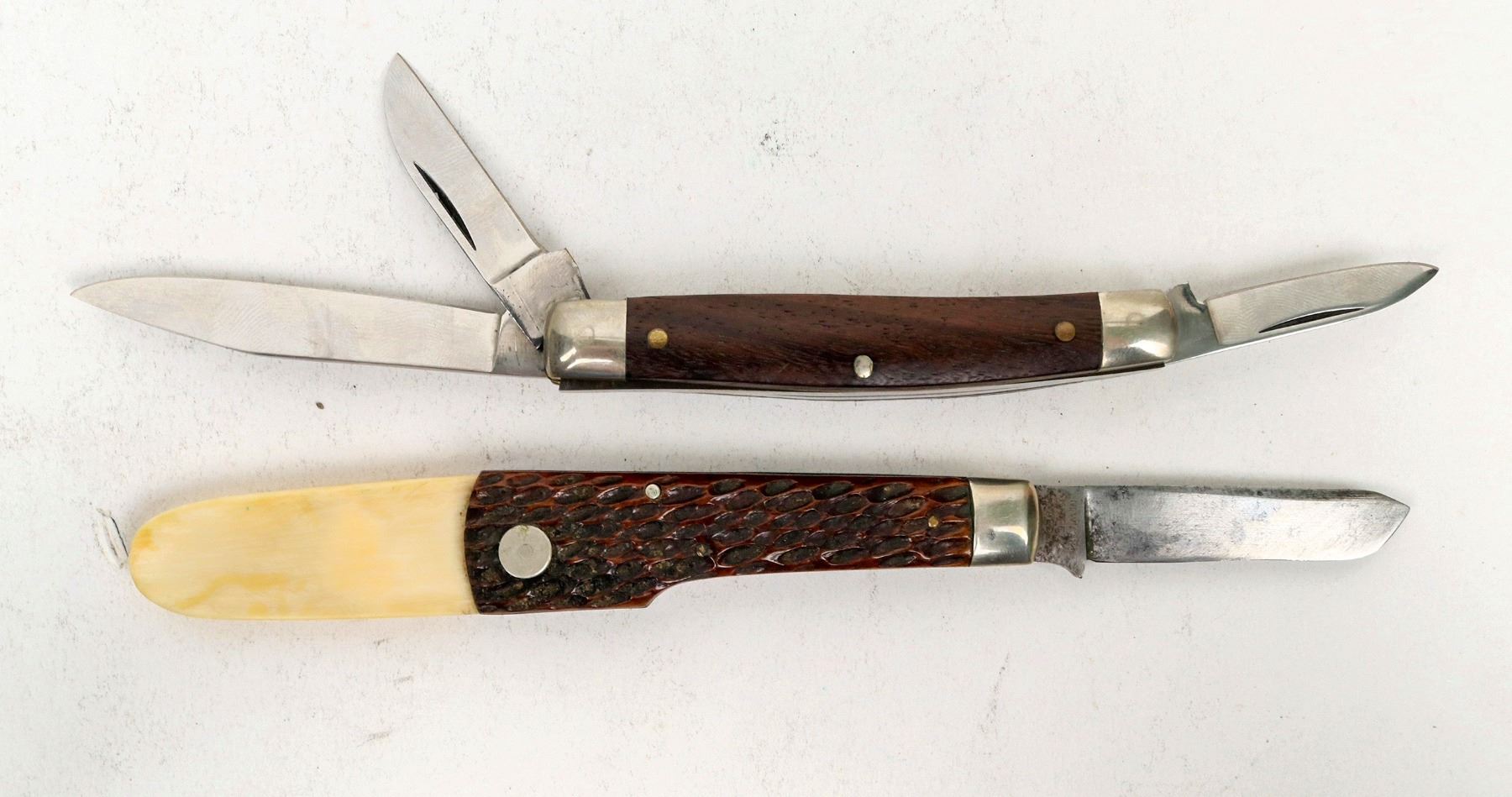 This lot has two knives: a Hammer brand grafting knife with paddle, and a Browning three blade Model 2518 "Browning USA" on the drop point blade. The Hammer grafting knife has used. The Browning has the original factory grind on the blades. Please see photo for details.