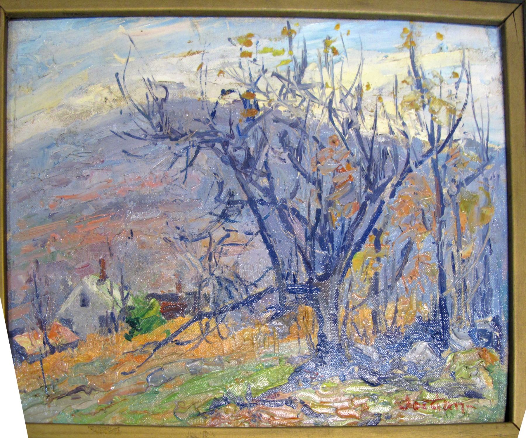 Oil on canvas, signed by the artist, Jordan. Framed in blue tinted wood, 11.5 x 10". Painting depicts idyllic scene from small hillside with large tree in foreground, overlooking a small row of houses. Painter identified as Lena E. Jordan. Original label on reverse states the painting was exhibited at the Springfield Artists' Guild Fourteenth Special Exhibition of Oil Paintings, Nov. 12 to Nov 27, 1932. Label reveals the painter's address, price and medium. Provenance: From the historical Ben-Tcahvtchavadze Collection of Ontario, Canada. State: Canada City: ontario Date: HWAC# 56004