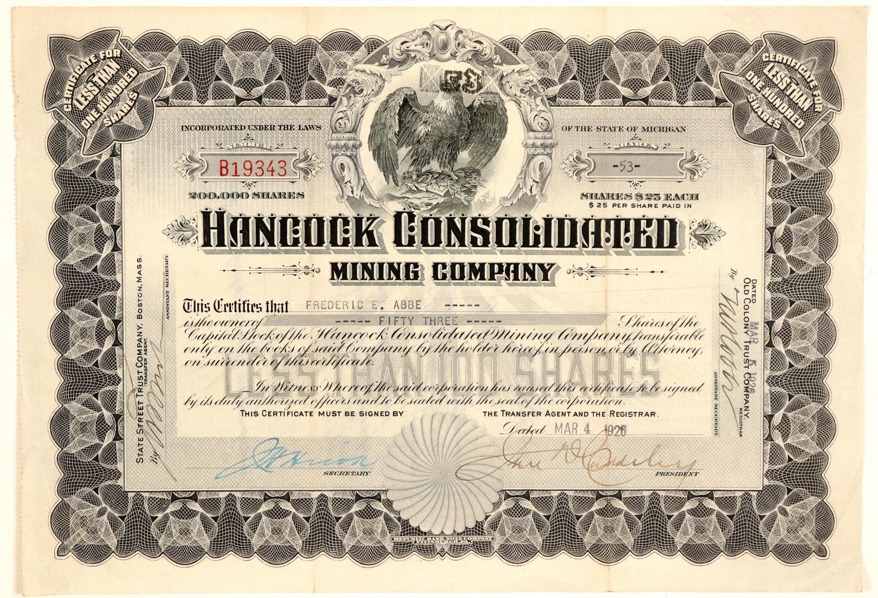 Inc. in Michigan in 1906. No. B19343, issued for 53 shares to Frederic E. Abbe on March 4th, 1926. Signed by the president and secretary (illegible). Not cancelled. Black border and print, gray background, eagle vignette. Pinholes, folds, creases. Republic Bank Note Co., Philadelphia. 8 x 11.5" Organized in 1906. Property consisted of 936 acres adjoining the Quincy Mine on the southwest. The original Hancock mine was set aside in 1859 by the Quincy MC. That mine operated in the 1860s and closed in 1885. Hancock is located in Houghton County, Michigan, on Copper Island, which is part of the Keweenaw Peninsula, on the Keweenaw Waterway directly opposite Houghton, Michigan. [Re: A History of the Northern Peninsula of Michigan and Its People, 1911] Houghton Estate Collection