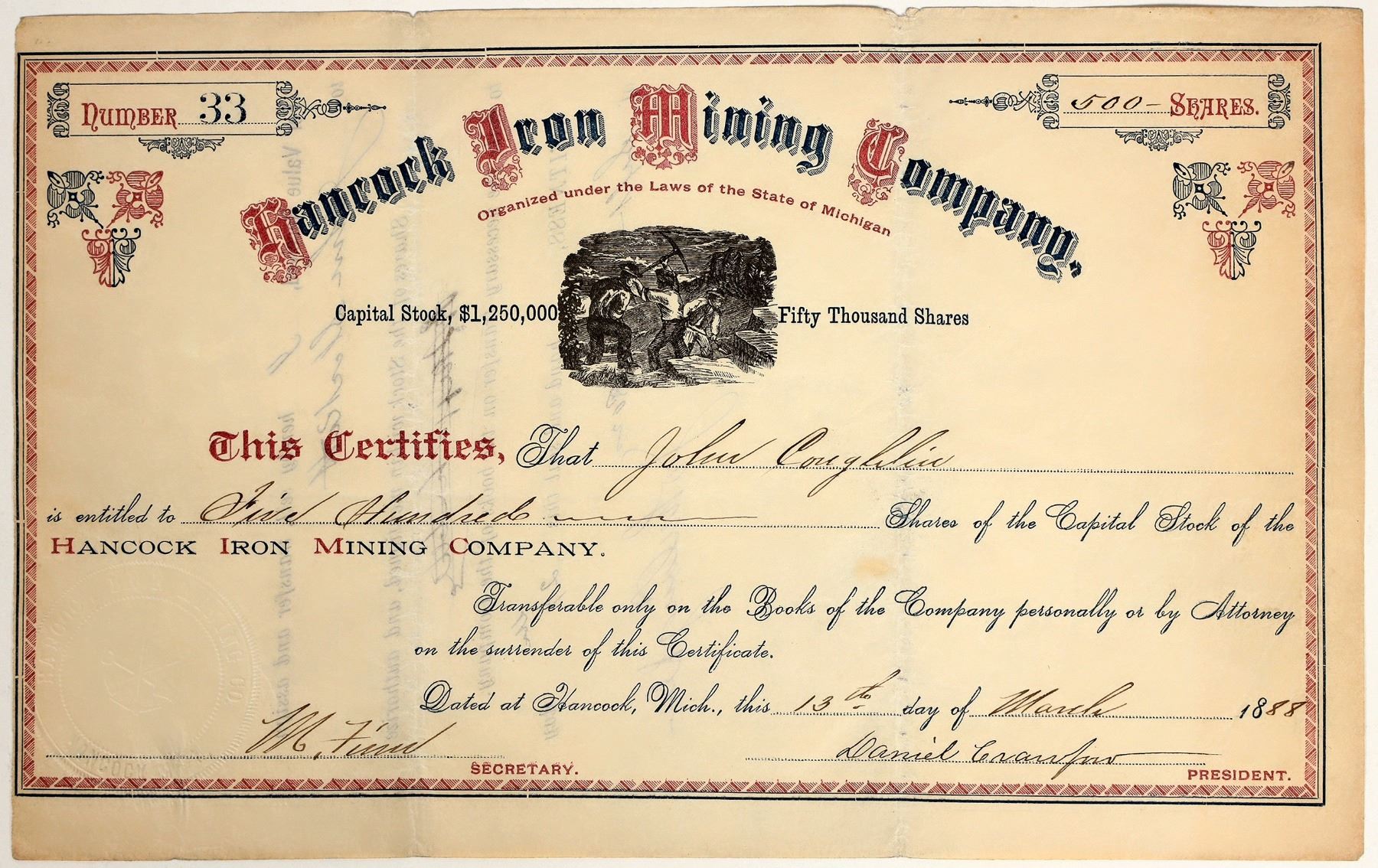 Organized under the laws of the state of Michigan. No. 33, issued for 500 shares to John Coughlin in Hancock in 1888. Signed by president Daniel Crawford and the secretary. Not cancelled. Mining vignette and red and blue print. Folds, toning. 6.25 x 10" The mine, founded by the Hancock Exploration Gold Prospect, worked the Marquette Iron Mining District, Michigamme, Baraga County, Michigan. USGS report has gold as the primary and Vanadium as secondary commodities. In Degood, there are a number of Hancock mines mentioned but no iron mine. Possibly related to Hancock Copper, as the single known example for that company was the same time period.
