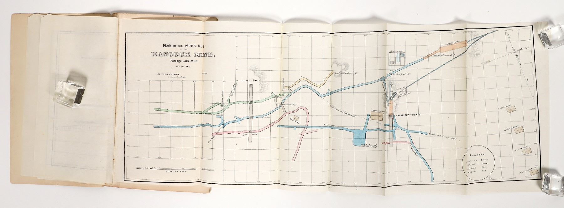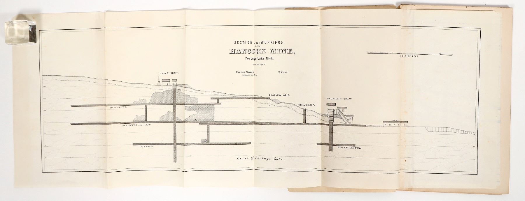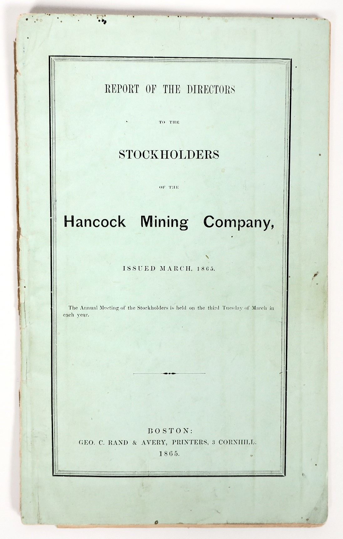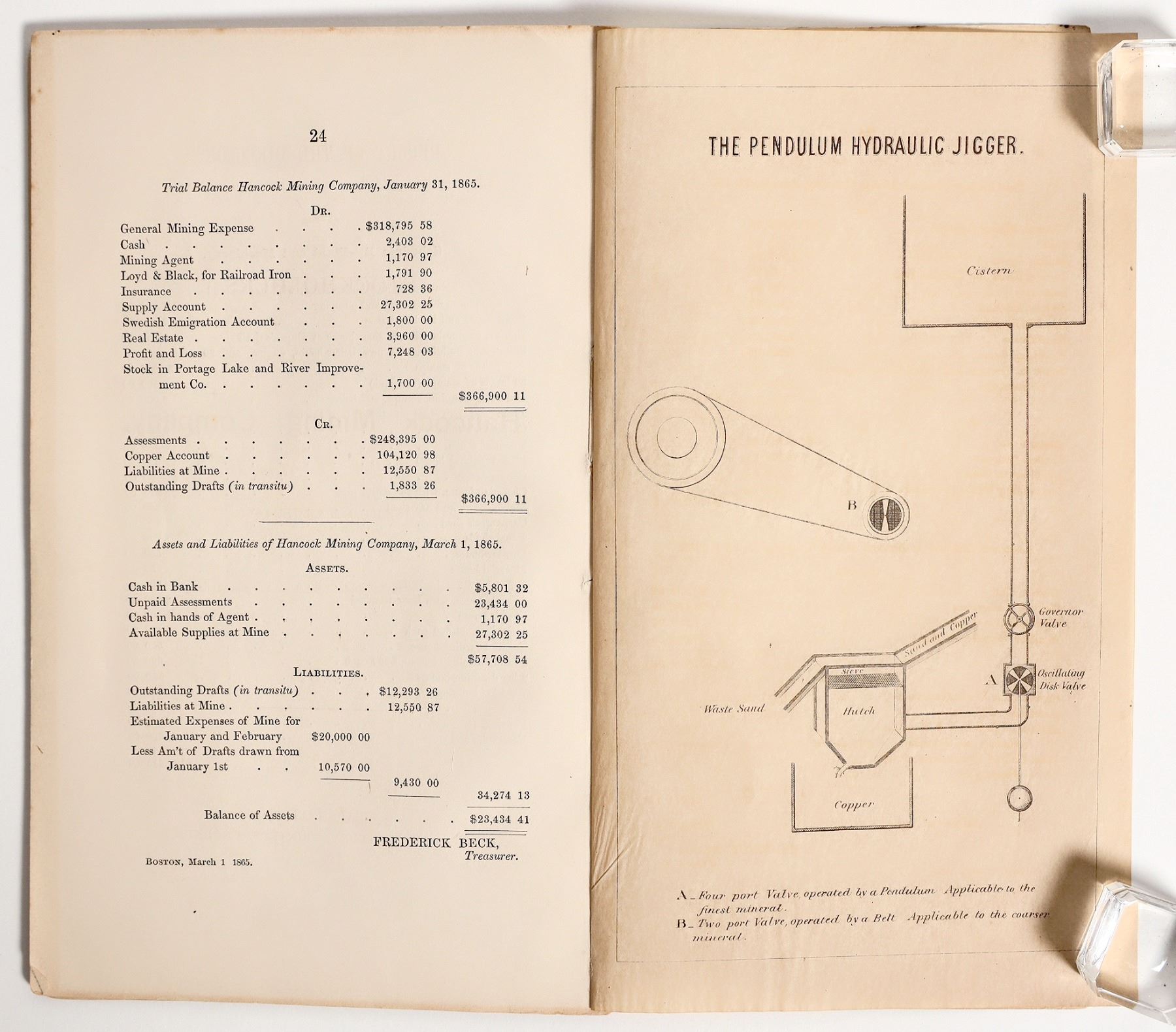 A booklet entitled 'Report of the Directors to the Stockholders of the Hancock Mining Company, Issued March, 1865'. The report provides a brief summary of the Hancock Mine's operations and finances over the previous year as well as two foldout maps of the mine's workings -- one color-coded, depicting the mine layout from above, and one B&W depicting its layout from the side. The Hancock Mine was established near Portage Lake, Michigan; the map contains a note of its location as well as the groundwater level of the lake. It also includes a diagram of the mine's Pendulum hydraulic Jigger.