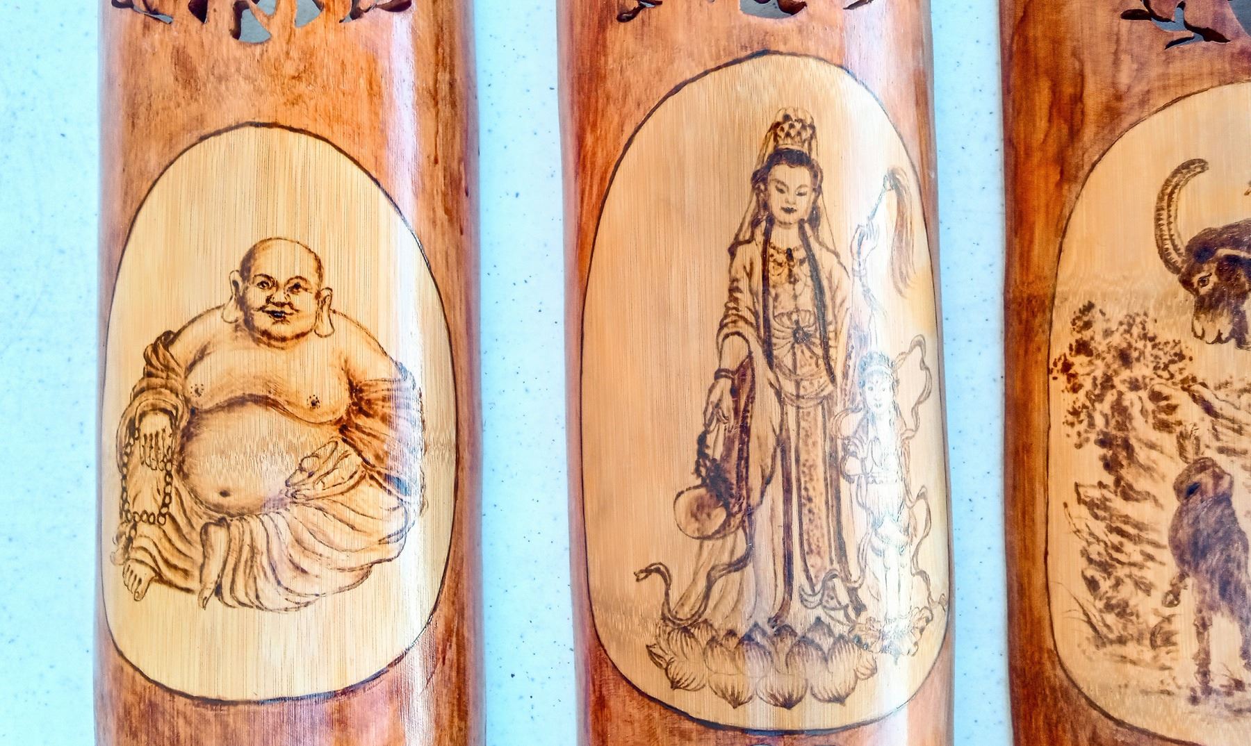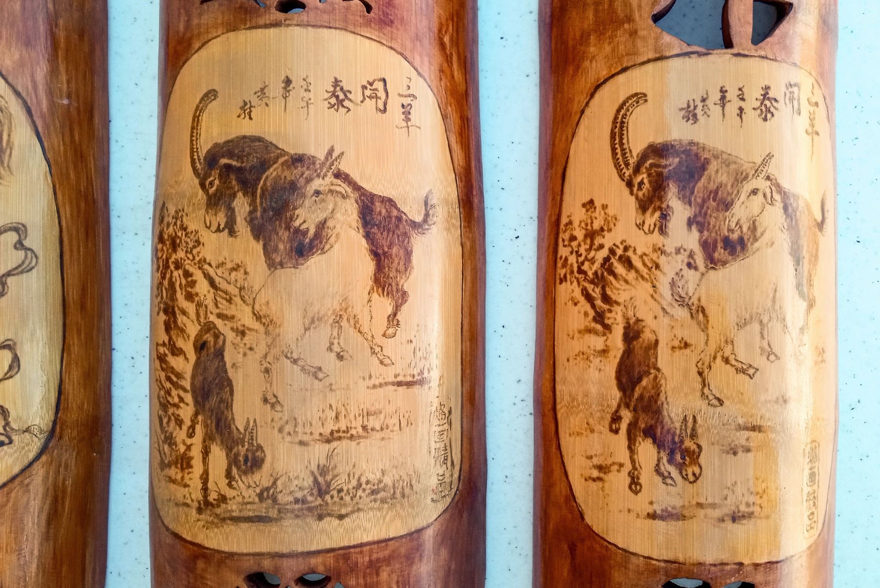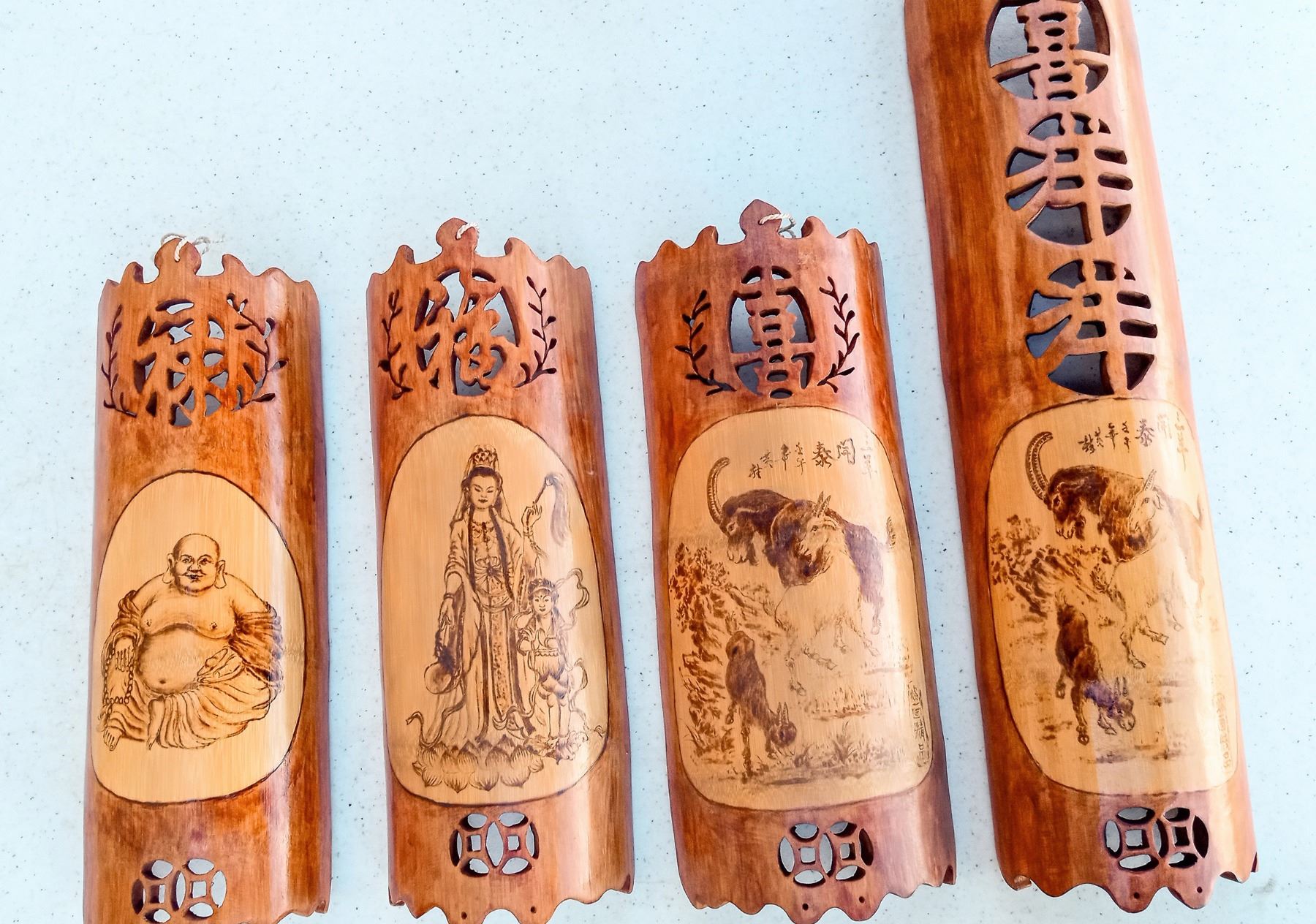 Lot includes 4x bamboo wood carvings, hand made, burned, with scenes of animals, woman with child, & Buddha. 3x short at 16x6", & 1x long at 20x6". Chunlin Collection.[ China Chunlin Zhu Collection