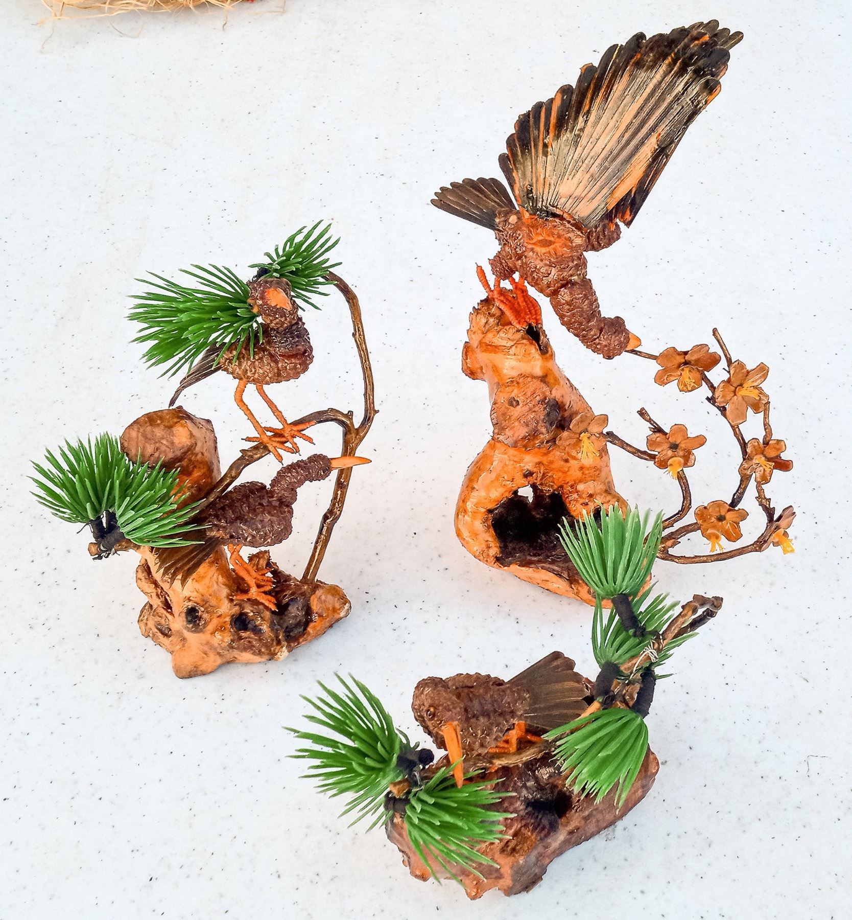 Lot includes 3 sculptures of birds in nature made from lacquered pinecones, 2 hardwood stumps/roots carved with a smiling Chinese man with a staff, and 2 coconut wood masks depicting the faces of bearded Chinese men. Chunlin Collection.