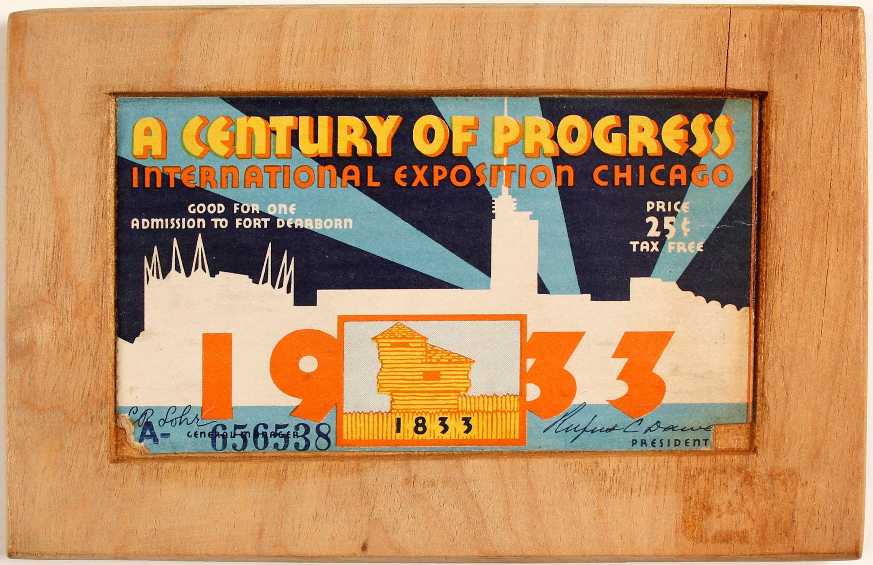 Hand carved 5.5" x 3.5" "A Century of Progress, International Exposition Chicago, has 2 revenue stamps on back. Salvatore Falcone Collection. State: City: Date: 1933