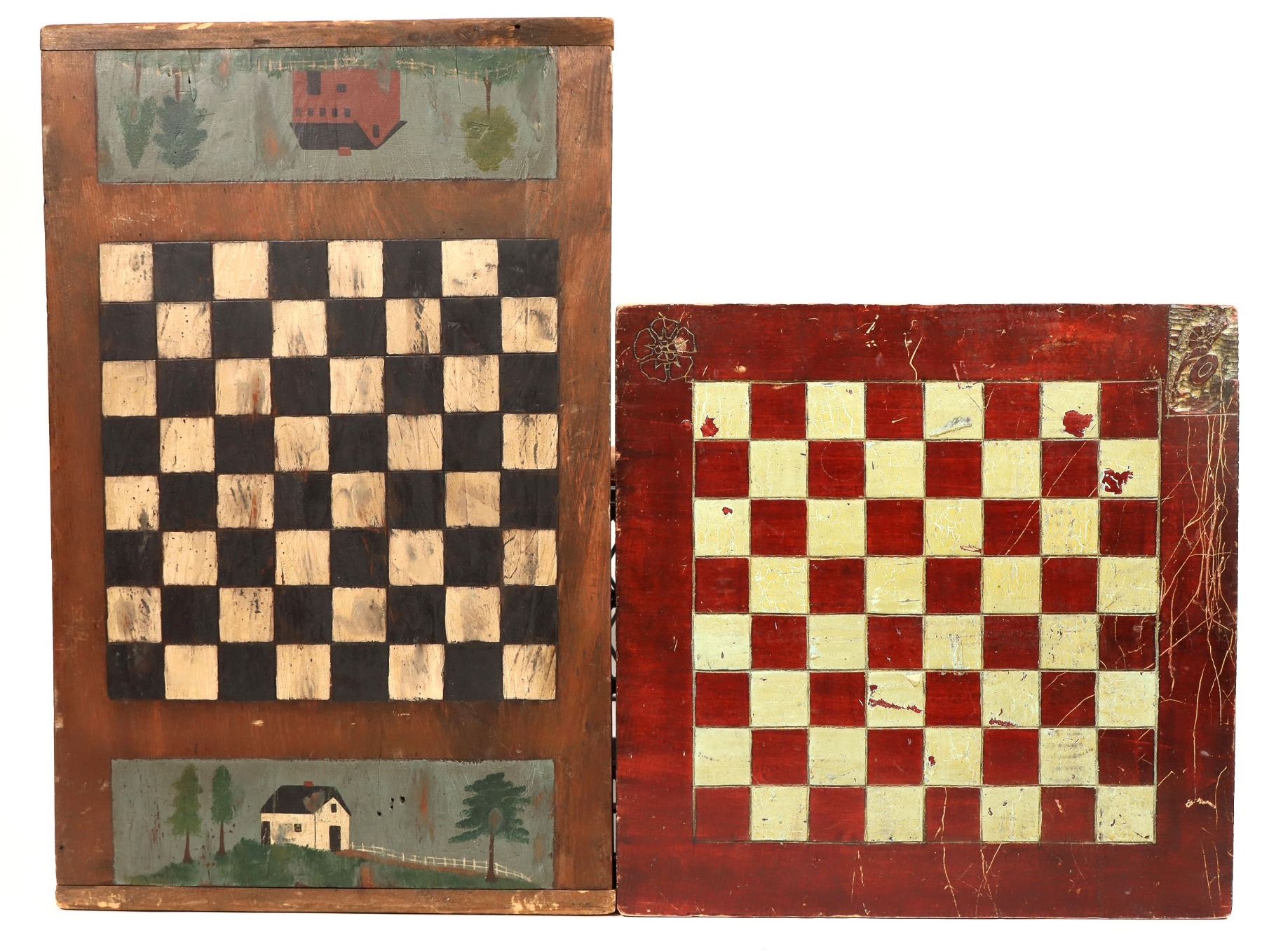 A pair of hand carved and painted chess/checker boards (2). One measures 15"x 23" and has hand painted home scenes on either end. The second one measures 16"x 16" and is also hand carved and painted. Both are in playing shape or can be hung. In nice condition. Please see photos for more details.