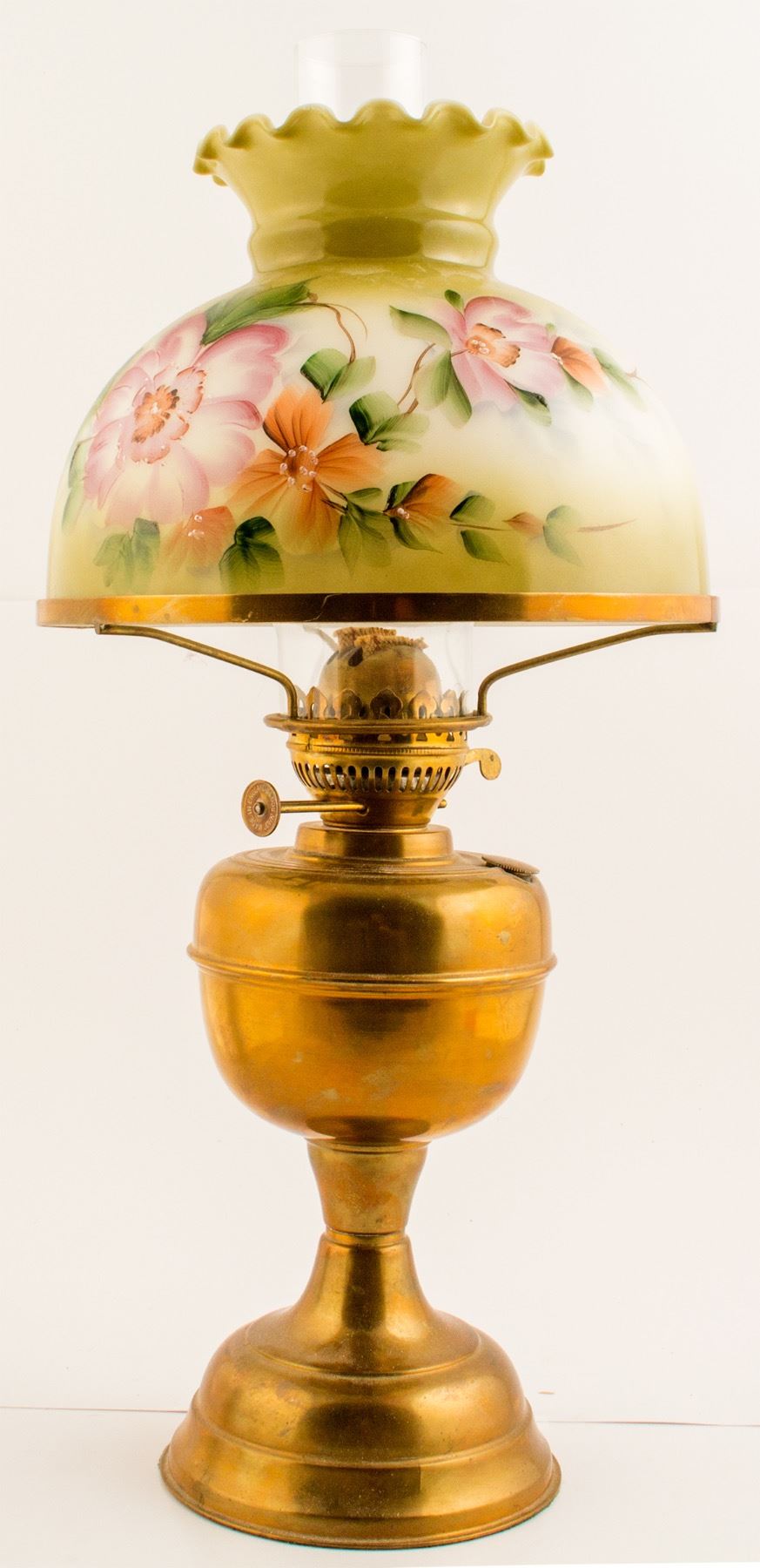 Fabulous old relic in fabulous condition. Shade has a diameter of 9". Green and white with pink and orange flowers. State: City: HWAC#: 48454 Date: