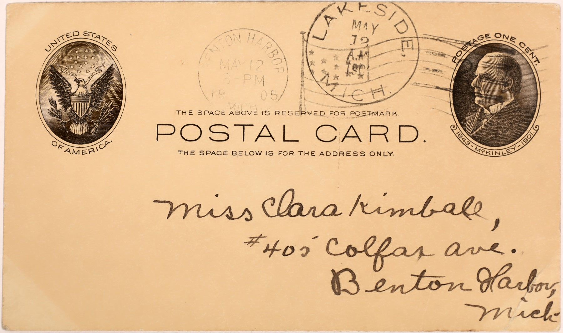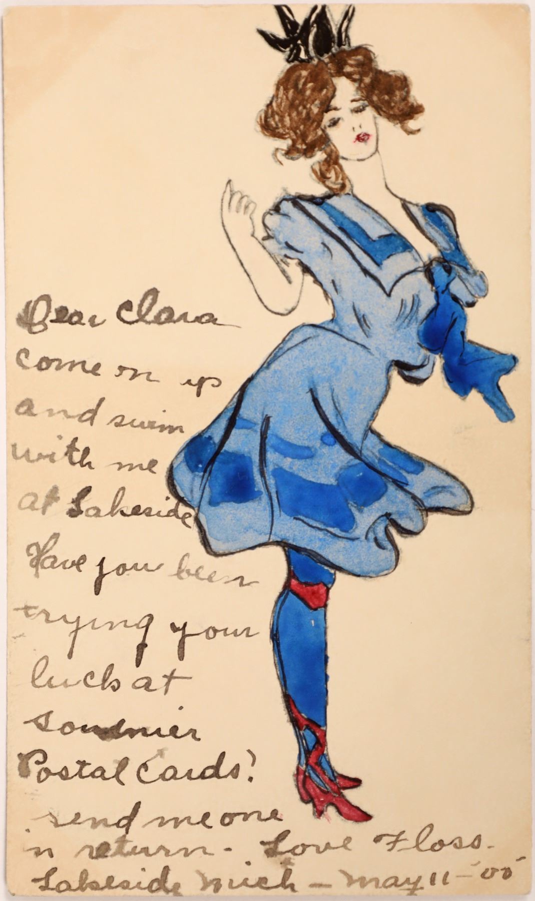 This is a hand-painted art card of a beautiful young lady in a period dress. About 1905. Postmarked Lakeside, Mich.