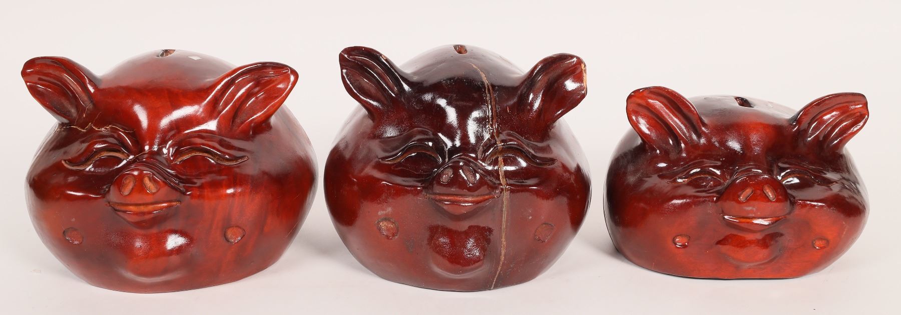 Lot includes three rosewood, hand-carved, piggy banks in 3 different sizes. Larges approx. 9x8x7", smallest approx. 8x7x6". Some cracking/splitting, but still solid and stable. Chunlin Collection.