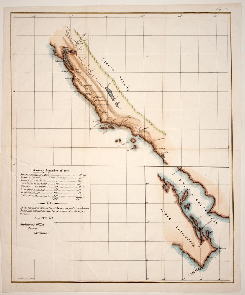 Hand-colored lithograph of California (Pre-gold Rush) showing forts and numbers of men. (15.5" H x 12.75" W). Burger Collection