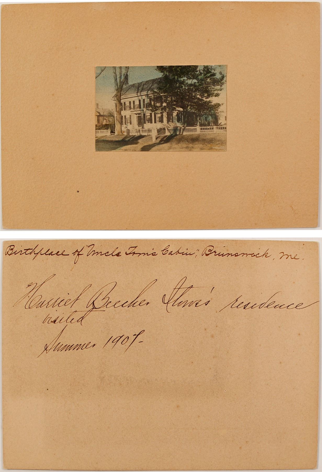 Small, mounted hand-colored photograph identified on the reverse. Photo is 1.75 x 2.75" on 5 x 7" mount. Dated on the reverse as Summer 1907, "Birthplace of Uncle Tom's Cabin, Brunswick, ME." Stowe and her family lived in the house from 1850 to 1852. During her time in Brunswick, she wrote "Uncle Tom’s Cabin" and sheltered John Andrew Jackson, a fugitive slave from South Carolina. The house is now a protected National Historic Landmark.