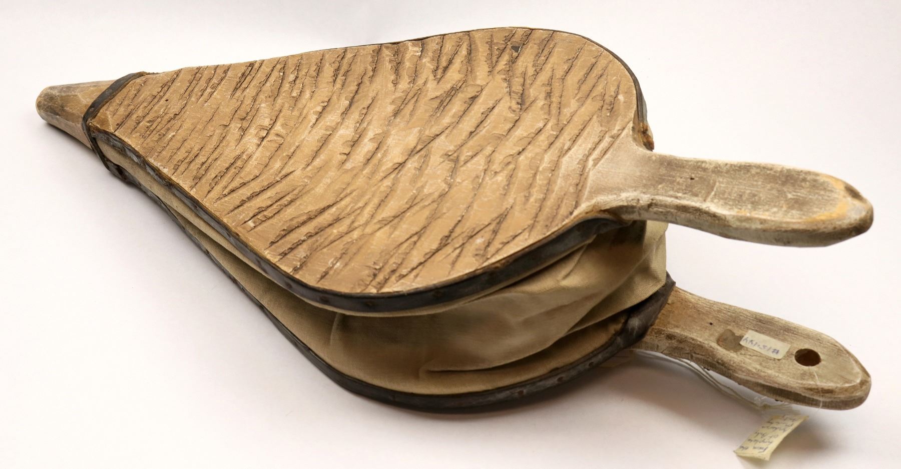This is a hand-made wood fireplace bellows about 26 in. long. It has cheselled sides, canvas cloth bellows and trimmed with leather and studding. Still functioning. C. 1970s.