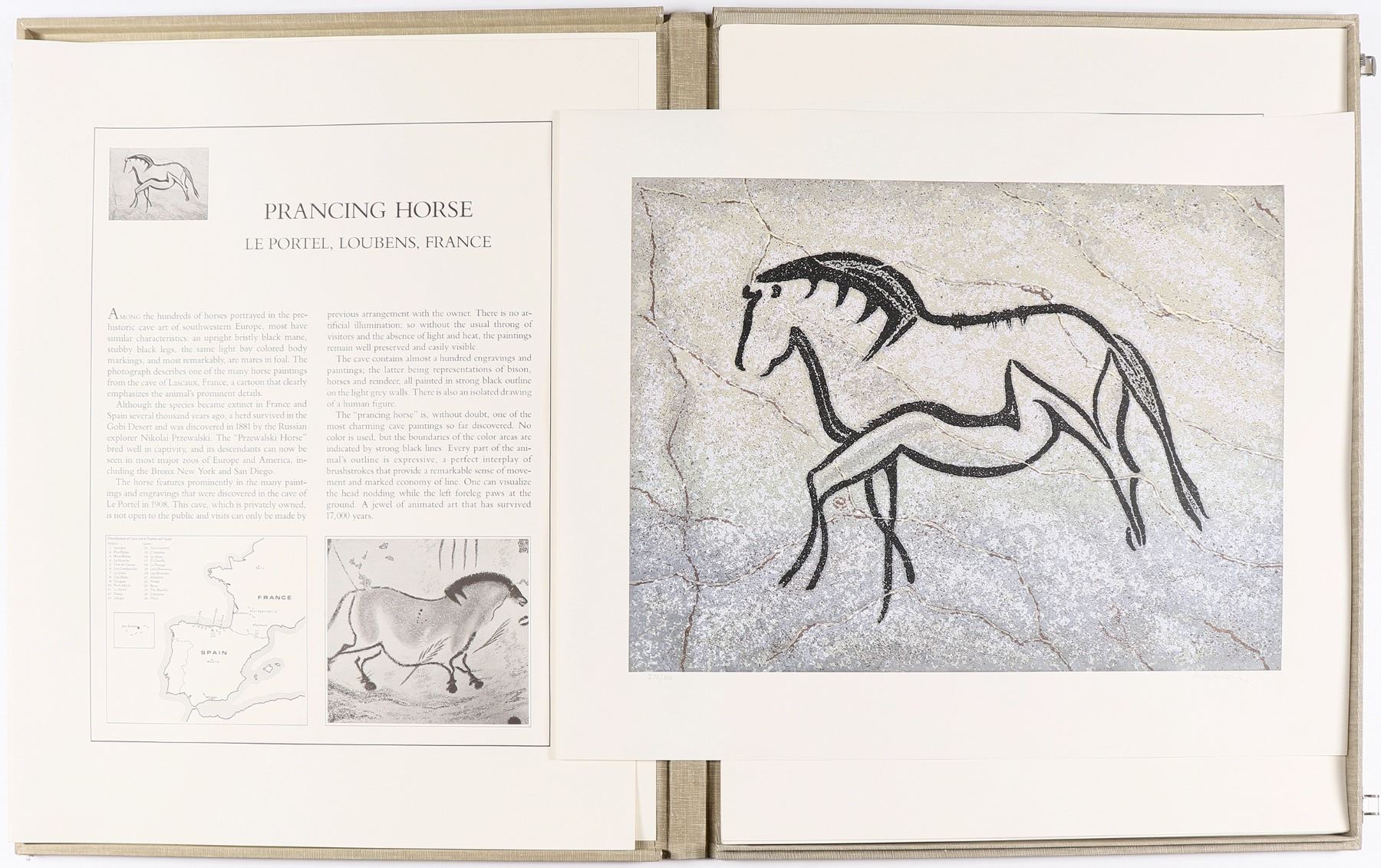 10 serigraphs in hard case folio of cave art by Douglas Mazonowicz, 1981. Introduction by Carl Sagan. #270/300. The reproduced cave paintings include: Bowmen and Deer, Two Figures in Finery, Engraved Frieze, Hunter and Ibex, Head of a Horse, Giraffe, Prancing Horse, Crouching Bison, Group of Antelopes, and Helmeted Warrior. Artist was born in England and died in 2001. Nice attractive set! 29x23". 11.6 lbs.