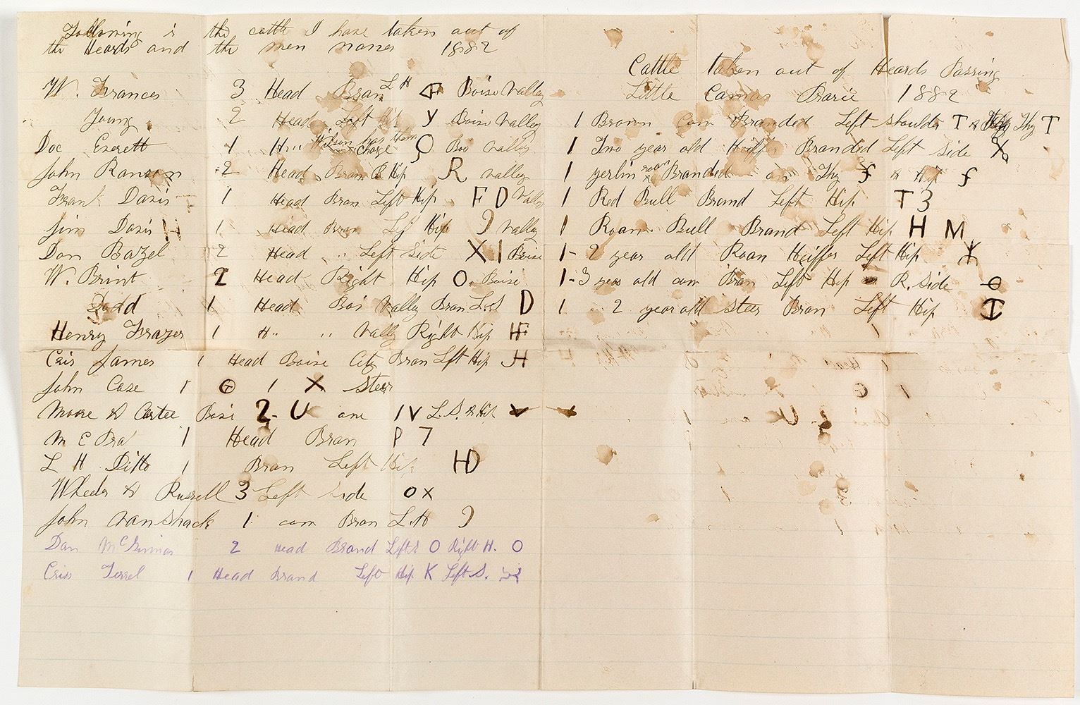 27 brands are listed in this unique brand's historical document. Find ranchers from Doc Everett to Frank Davis, to John Case to Wheeler Russell to .... Little Camas Prairie is northeast of Mountain Home in the Sun Valley area. Paper is in very fragile condition with rips at the folds. Still a special piece of history! Date: Location: Idaho HWAC# 46605