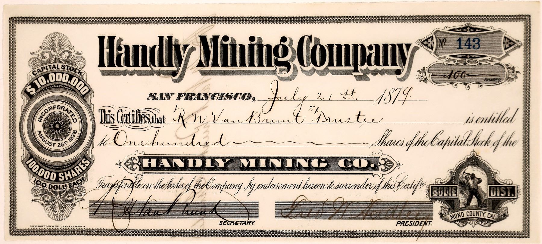 Rare. #143 issued to RN Van Brunt, Trustee for 100 shares on July 21st, 1879 in San Francisco. Signed by Edward Stone secretary and Fred w Hadley president. Not cancelled. Black border and print, mining vignette and location printed in the bottom right. Britton & Rey. Mine was located between the Goodshaw and Bodie claims. This was one of the earliest claims at Bodie, the ore contained $300-400 in gold per ton in 1878 dollars. Fred W. Hadley was noted as a banker. Pristine - no edge, corner, discoloration of pin hole issues. Bodie California Franklin Collection