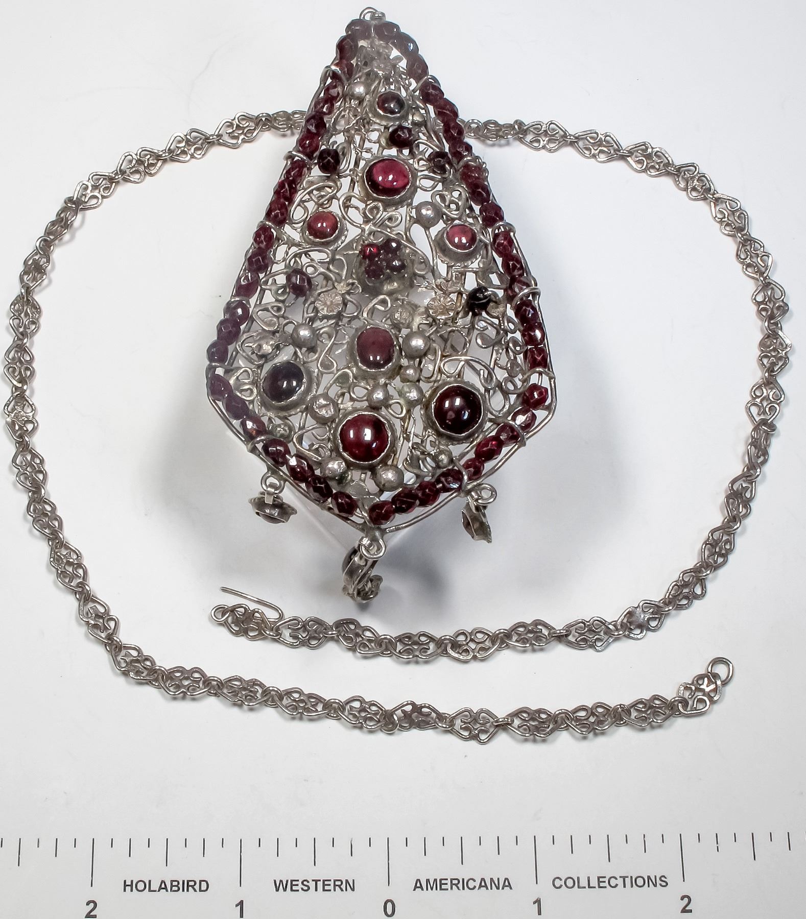 Garnet and silver necklace--hand wrapped and soldered silver wire with many garnets, cut and rounds. Extremely unusual piece--one of a kind. Possibly Afghani. Pendant measures 7" x 2.25", with 20" silver chain. Please see photos.