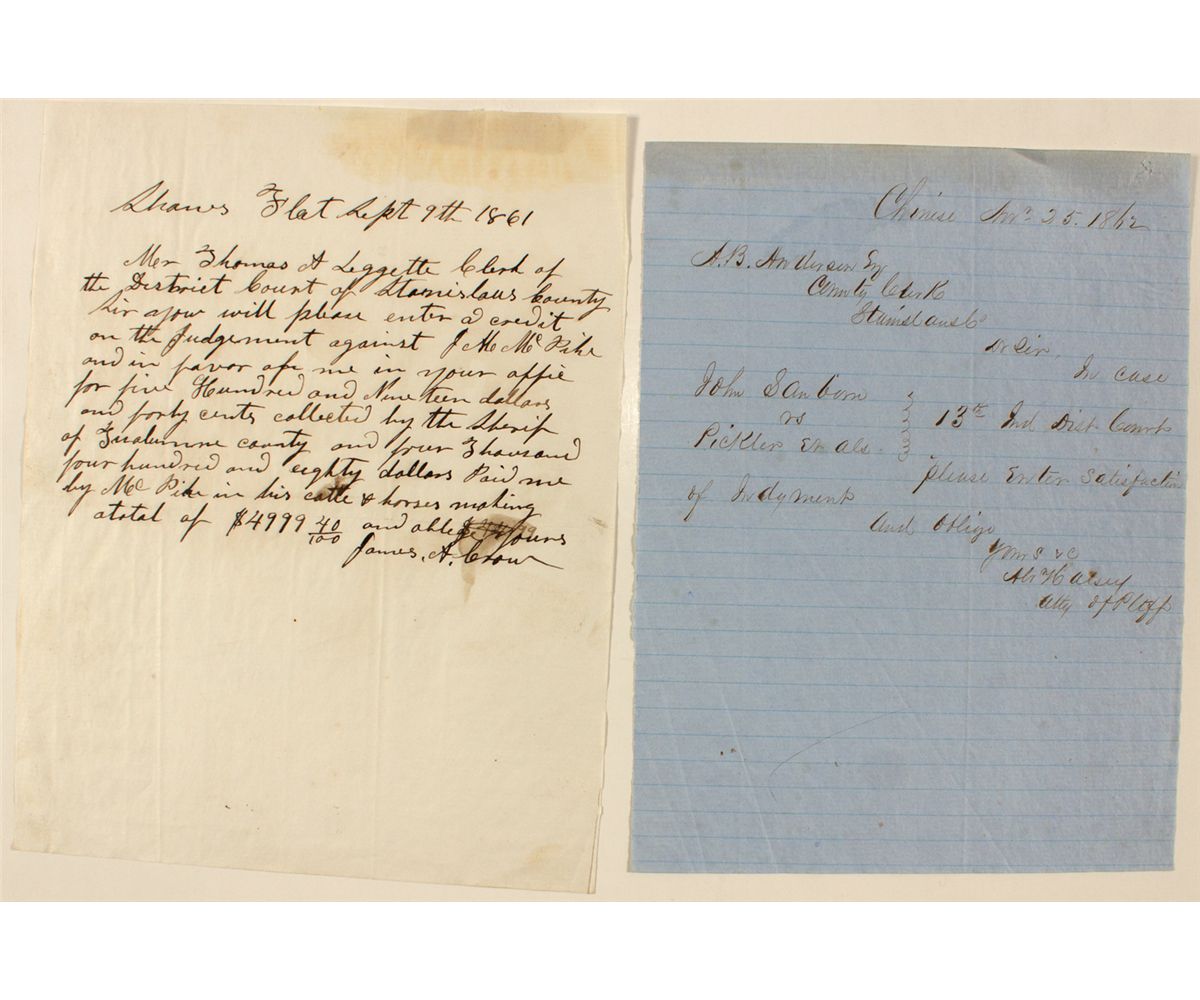 Lot of two early Stanislaus County court documents. 1) Dateline Shaws Flat, Sept. 9th, 1861. James A Crow (?) is asking the clerk of the district court to enter a credit on the judgement against J.M. McPike for $519.40 collected by the sheriff of Tuolumne County and $4,480 paid to him by McPike in cattle and horses. Some glue residue. 2) Dateline Chinese, Nov. 25th, 1862. Asking county clerk to enter satisfaction of judgement. Signed by the attorney of the plaintiff.