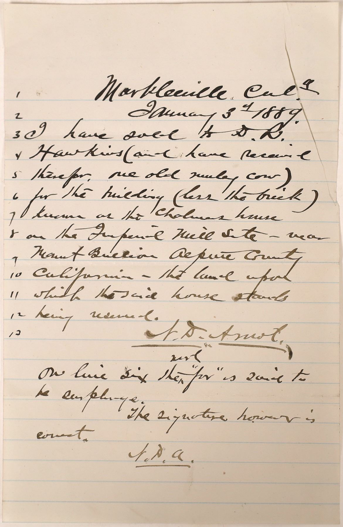 Dated January 3rd, 1889, a handwritten legal document detains the sale of the building known as the Chalmers House on the Imperial Mill Site near Mount Bullion Alpine County. Page is 5 1/2 x 8 1/2 inches, torn upper right corner repaired.