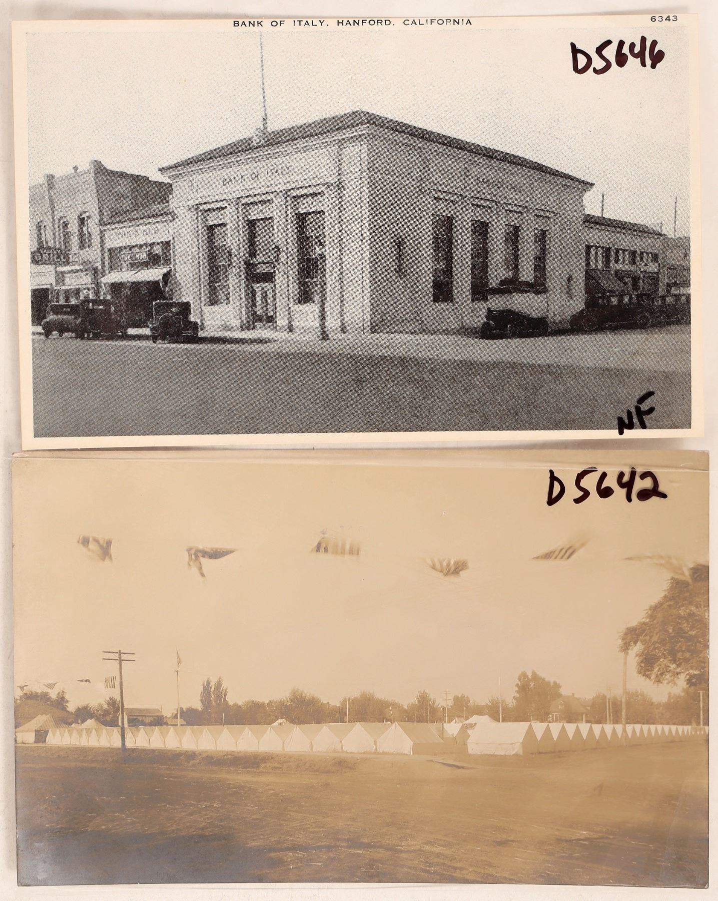 A pair of postcards from Hanford, Ca., from the early 1900s. Includes 1 RPC of tents and American flags, could be the Naval Air Station Lemoore; and 1 postcard of the Bank of Italy.