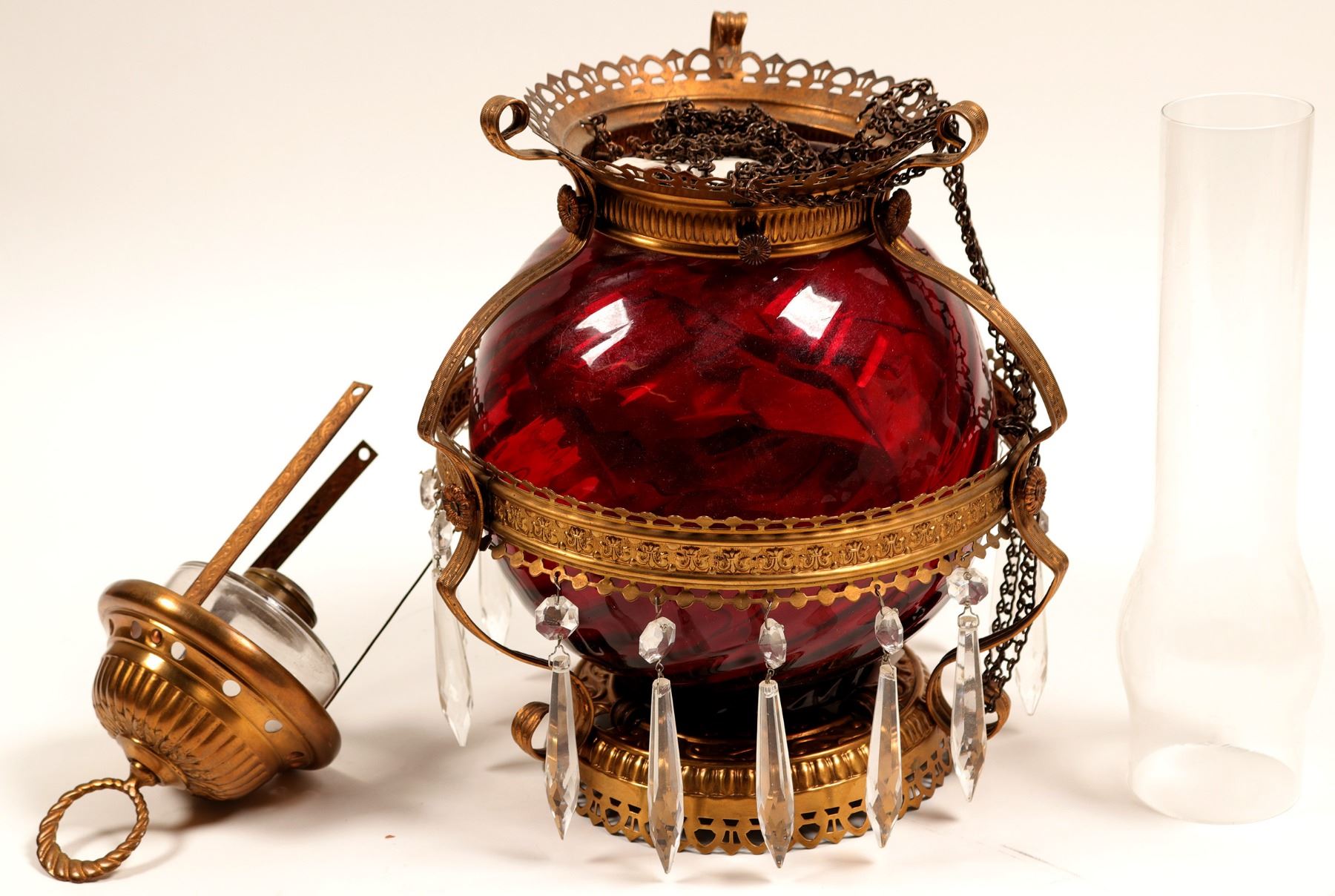 Here is a very sweet item. It is an early lighting fixture. It once hung in a brothel , in Wall Walla , Washington. It is a complete unit with the chains and even has hanging glass prisms. But, the best part of the lamp is the shade. It is a beautiful, cranberry red colorization, with a swirling, left to right ribbed pattern. When this lamp is lite, and the flame flickers, its a sight to behold. Red glass is highly desirable, cause its made from gold or nickle .Very rare, and in perfect condition. Don't miss this item, it will light up your life !! (RH).