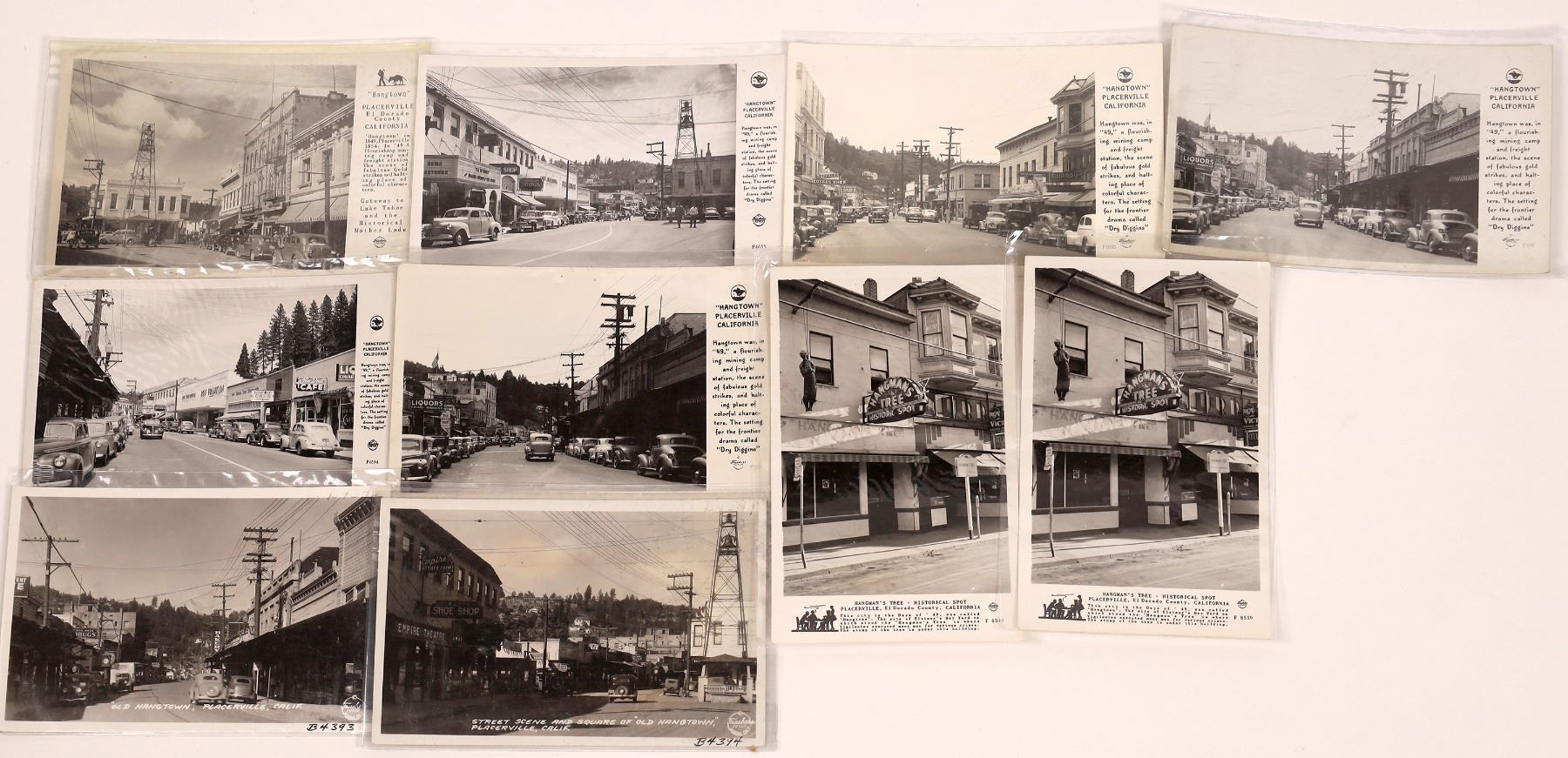 Lot of 10. Frashers Ford Card pub. RPC's , ,white borders. Two w/writing, one postmarked Pittsburg CA. 1951, 1 cent stamp. Street level view: Old Mining camp district , Hangman's Tree Cafe. Hangtown or " Old Dry Diggins in 1849, got it'd name when three men convicted of murder, robbery and attempted robbery were hanged on an oak tree on the spot know as Elstner's Hay (now occupied by Hangman's Tree Bar). The name was changed to Placerville (because of the gold) in 1854 when incorp.