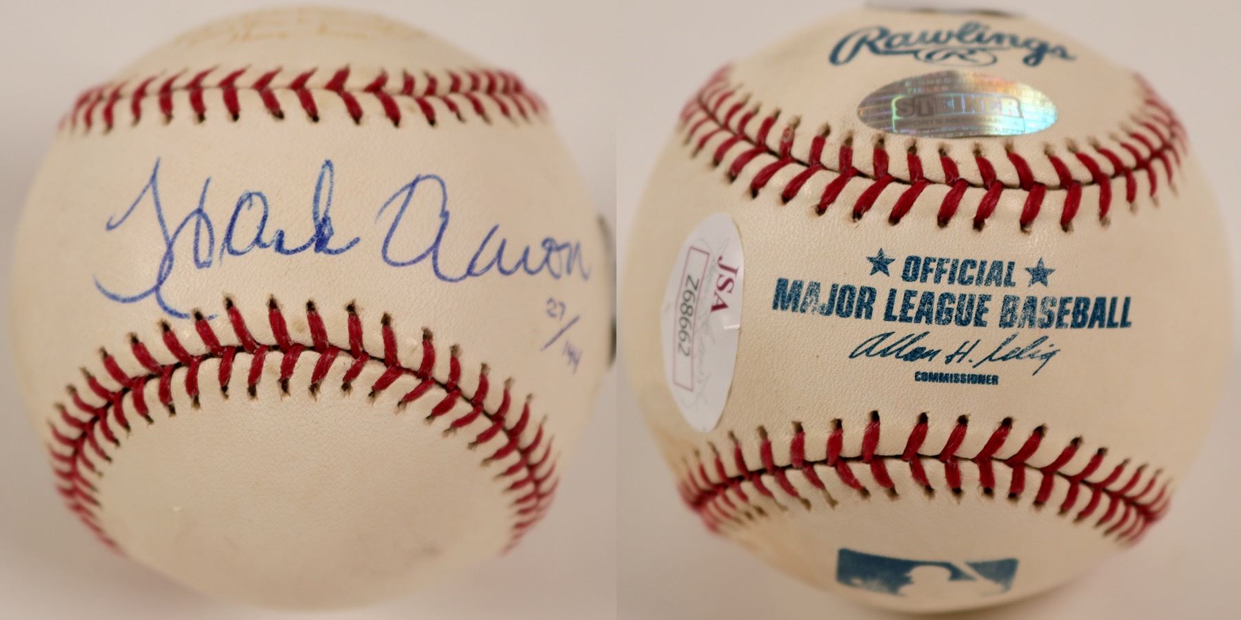 This is an autographed baseball signed by Hank Aaron of the Miwaukee Braves and later Atlanta Braves. JSA # Z68662. Number 27/144. Hank finished his baseball career back with the Milwaukee Brewers. His stats. do not need repeating to say that he is one of the all time great players in baseball. He was admitted to the Baseball Hall of Fame in 1982. The Hank Aaron Award was established in MLB in 1999. Hank also was awarded the Presidential Medal of Freedom in 2002. This is the ultimate collector's item baseball. It is inscribed:"I don't want people to forget Babe Ruth. I just want people to remember Hank Aaron."