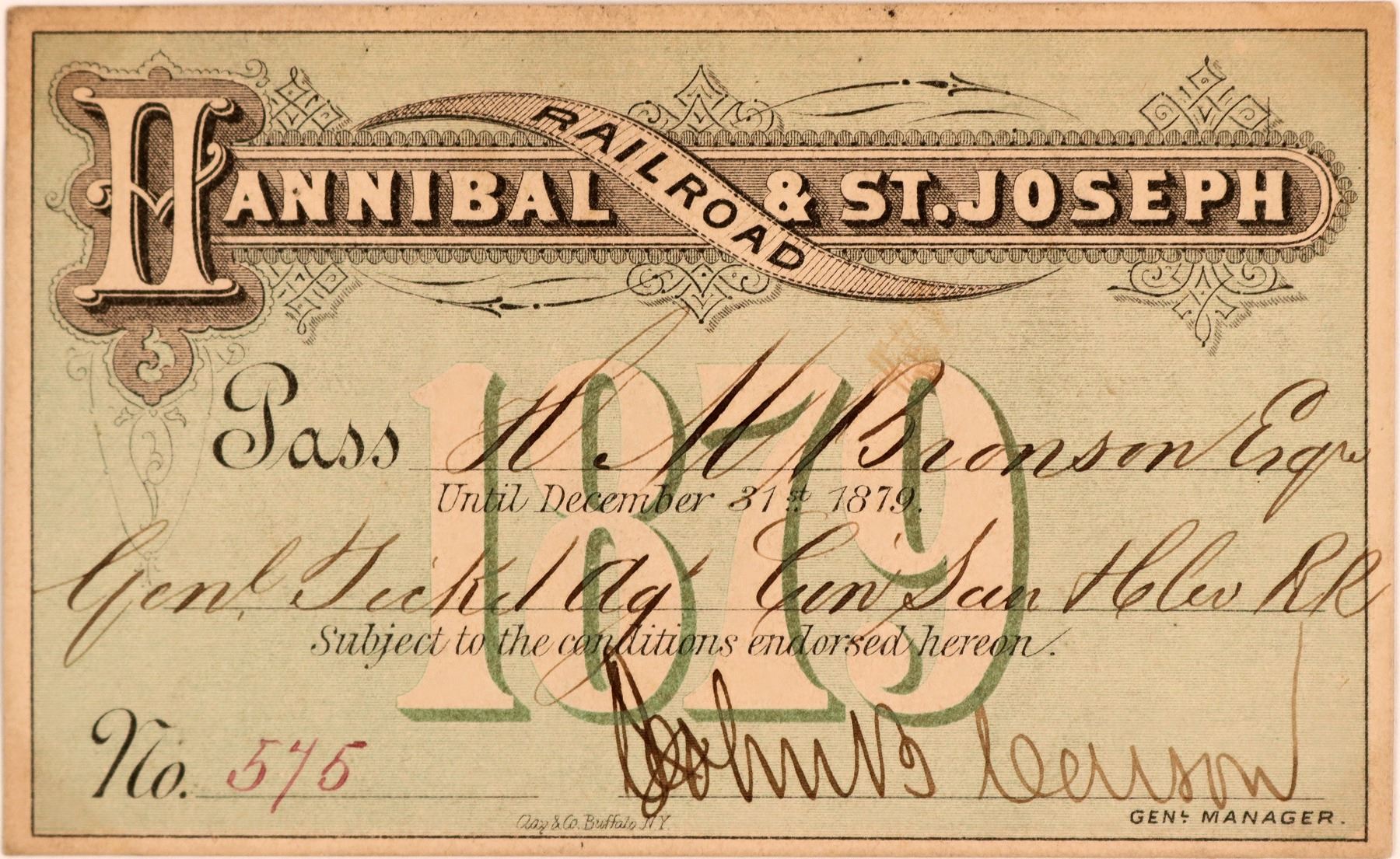 No. 576, issued for 1879 to H. Bronson esq., General ticket agent for Con. San. & Clev. RR. Signed by general manager John Carson. Black and white print on cardstock with green underprint. Printed by Clay & Co., Buffalo, NY. Some soiling and toning. The Hannibal and St. Joseph Railroad was the first railroad to cross Missouri. It is said to have carried the first letter to the Pony Express on April 3, 1860, from a train pulled behind the locomotive Missouri.