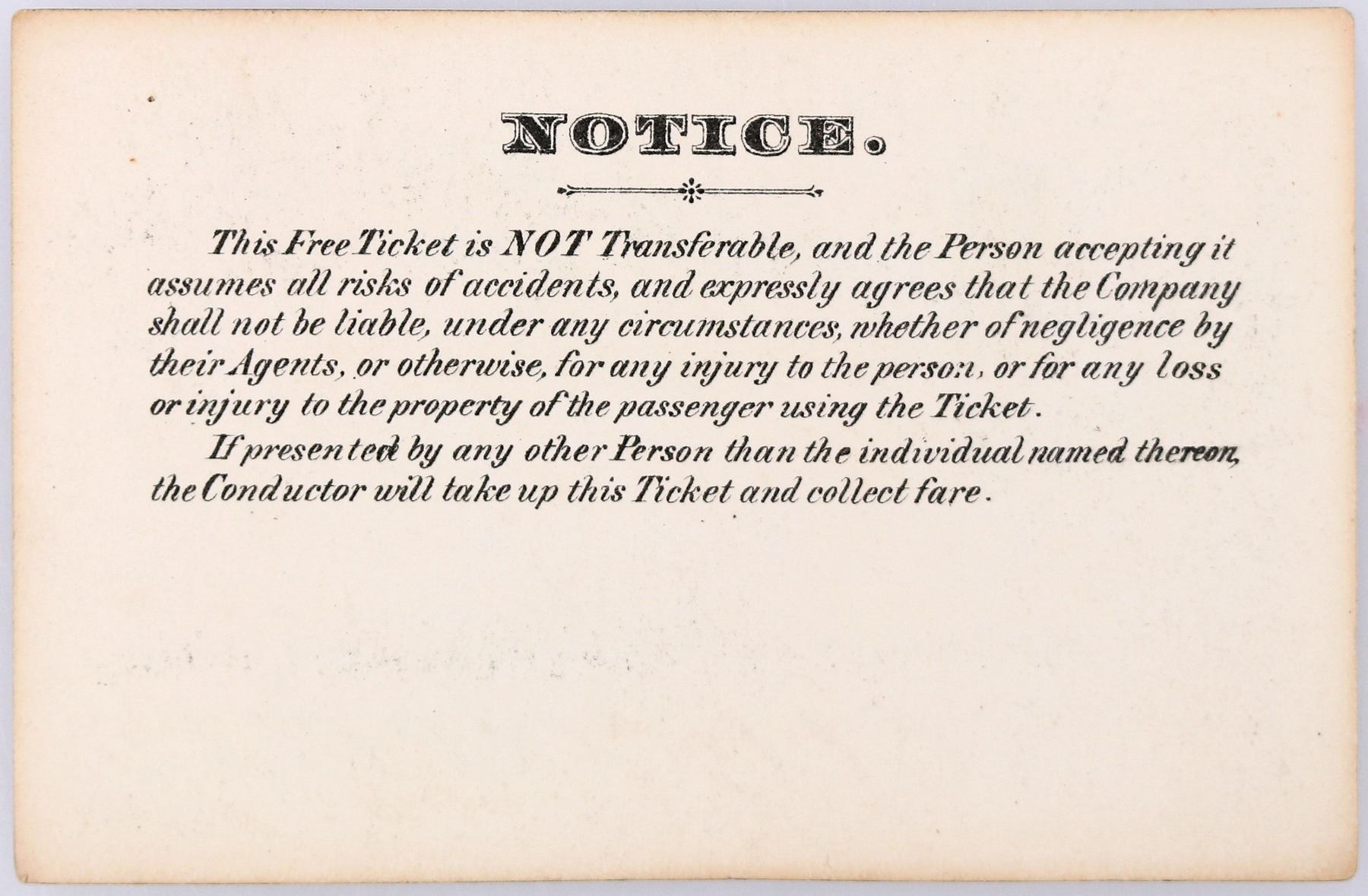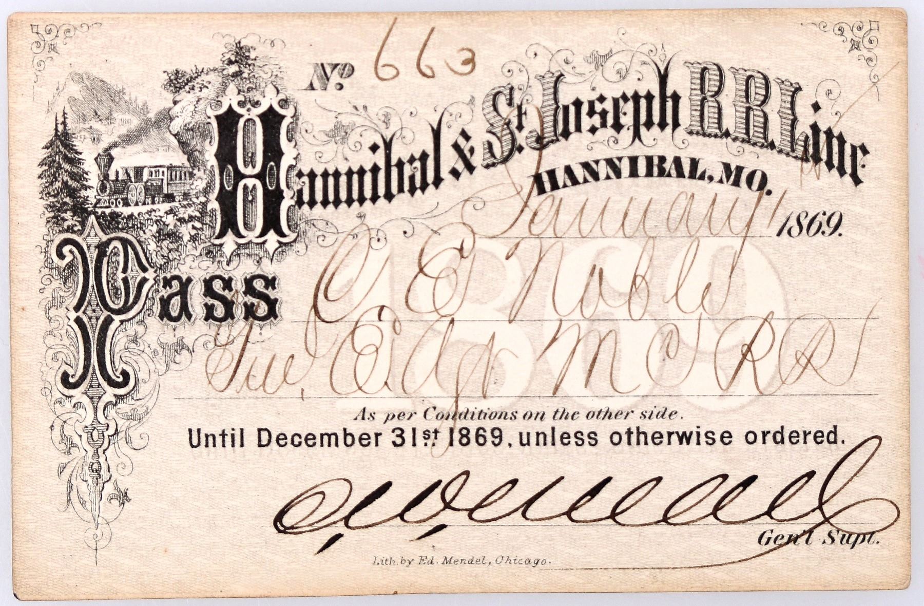 Choice early pass for this famous railroad. Pass no. 663, issued for 1869 to CE Noble of the MCRR. Signed by the general superintendent. Very attractive design with fancy logo and small locomotive vignette. Lith. by Ed. Mendel, Chicago. The Hannibal and St. Joseph Railroad was the first railroad to cross Missouri. It is said to have carried the first letter to the Pony Express on April 3, 1860, from a train pulled behind the locomotive Missouri. Plans for the first railroad to run east to west across the state of Missouri were made in the office of John M. Clemens, father of Samuel (Mark Twain) Clemens, in the spring of 1846, in Hannibal, Missouri. Attorney R. F. Lakenan drew up the charter, "An Act to Incorporate the Hannibal and St. Joseph Railroad Company", which was passed by the Legislature in February, 1847. When the work was finally completed the train carried a bottle of water from the Mississippi River to be poured into the Missouri River signifying the joining of the two rivers by the steel rails.