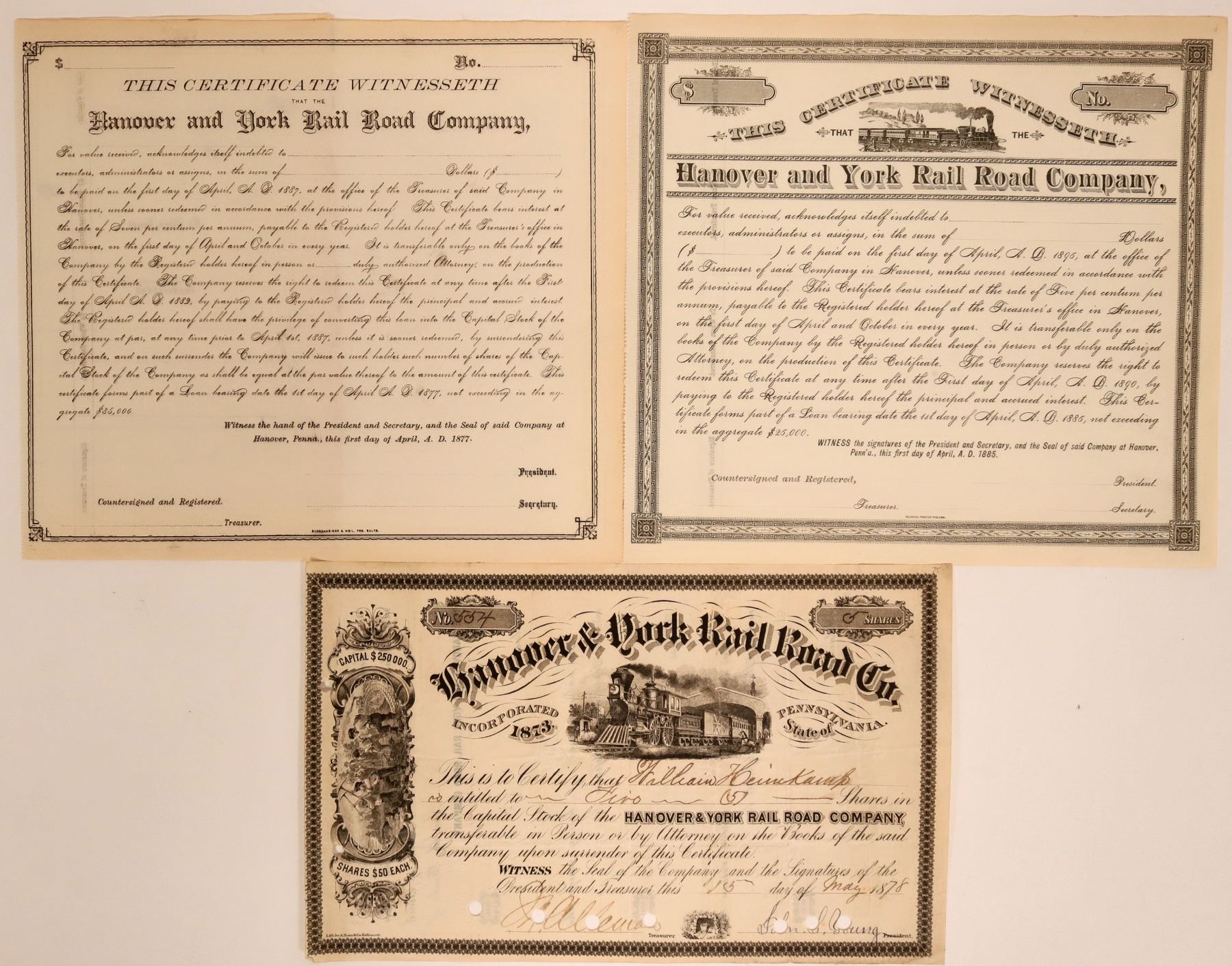 3 certificates. Incorp 1873 Pennsylvania. 1. #554, I/C, 5 shares @ $50 par issued May, 15, 1878. Black, embossed seal w/train center, vignette under arched title train r-l w/ company name on tender exiting terminal. Left column Men laying RR track. A. Hoen & Co. printer. Cert. # 1 is thought to be only one in circulation until now. VF 2. U/U, not numbered, amount to be determined, 5% due 1895. Dateline April 1, 1885. Vignette top train w/ cars l-r passing countryside. Wm. Mann printer. EF 3. U/U, not numbered, amount to be determined, 7% due 1887. Dateline April 1, 1877. no vignette. Receipt attached, Guggenheimer & Weil printer. EF