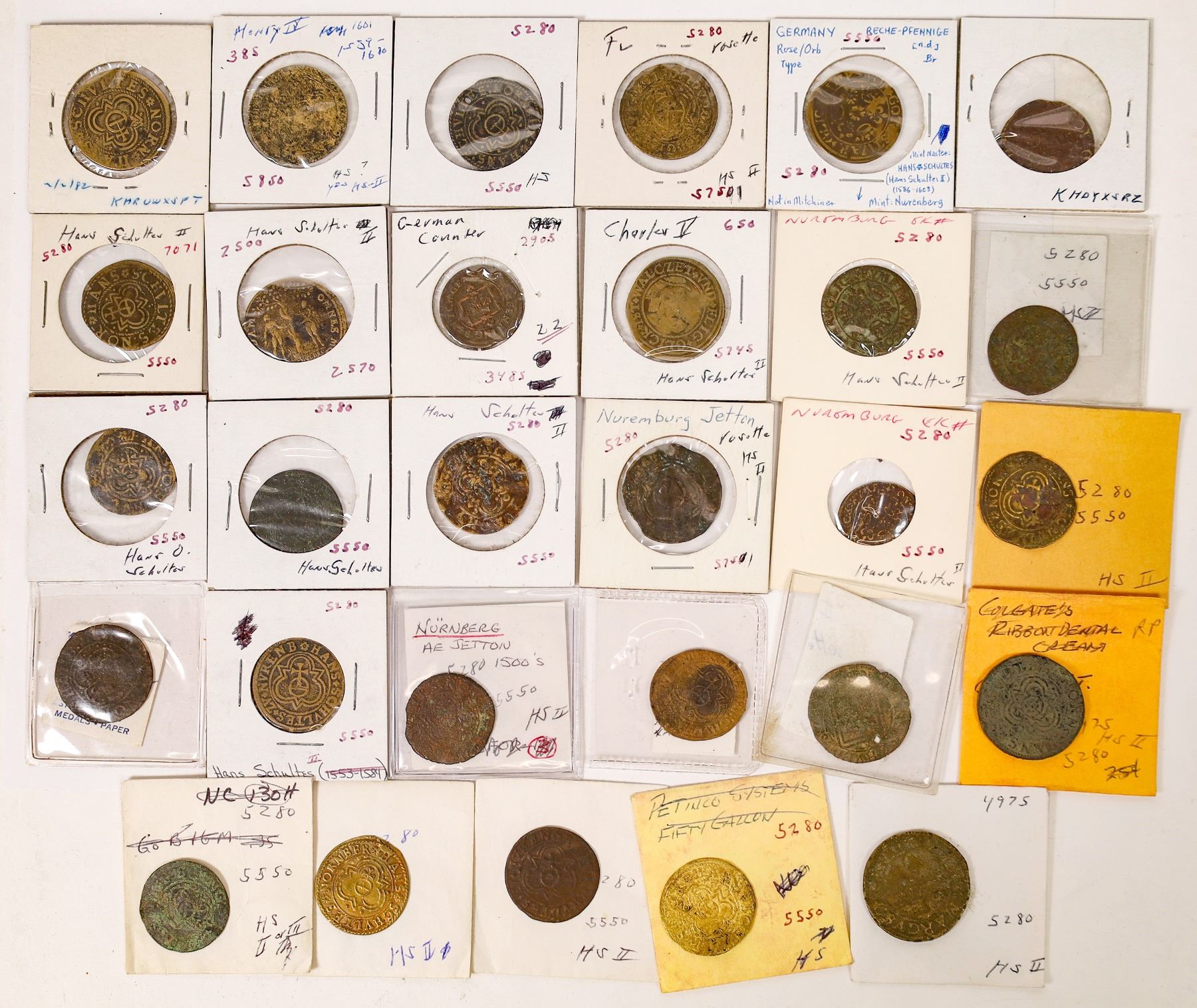 Lot of 29 spiel markes made by Hans Schultes of Nuremberg. The Schultes family made jetons from 1515 through 1612.