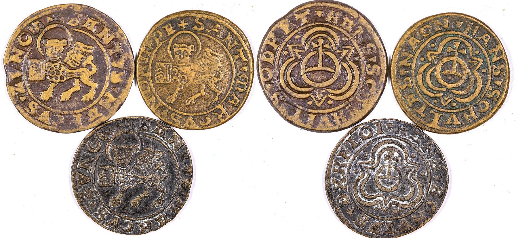 Lot of three examples of Nuremberg mint master Hans Schultes jetons. There were three Hans Schultes from 1553 until 1612, Hans I, Hans II and Hans III. One of the counters is attributed to 16th century Venice.