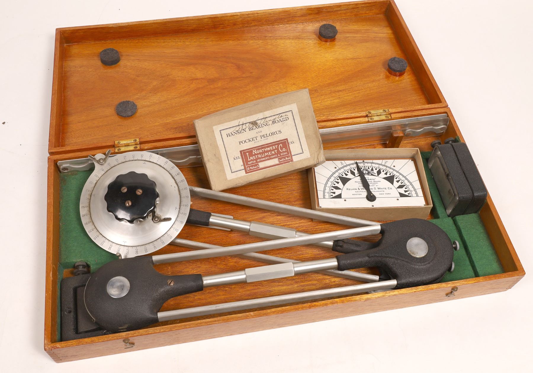 Housed in a beautiful wooden case, (25 1/2 x 12 x 4 ") appears all in original condition. A pelorus is not a compass but an instrument used to measure a bearing at sea relative to the ship's axis, also known as a "dumb compass." The instrument was named for a fellow named Pelorus, said to have been the pilot for Hannibal, circa 203 BC. Sold by Northwest Instrument Co. of Seattle, Washington, it appears to date from the early 20th century. Wilfrid O. White (1878-1955) was a native of Australia who studied with Lord Kelvin in Glasgow before settling in Boston in 1902 and establishing the firm of Kelvin & Wilfrid O. White in 1919. The firm became Wilfrid O. White & Sons, Inc. in 1950.