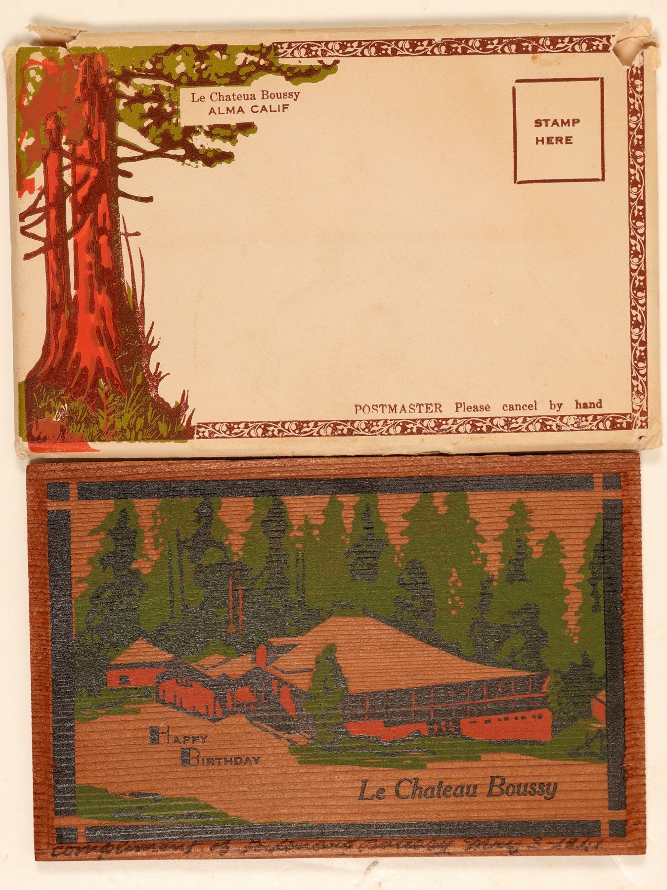Redwood Happy Birthday souvenir plaque from Chateau Boussy, inscribed on bottom 1941. In original pictorial mailing envelope. 4x6"Salvatore Falcone Collection